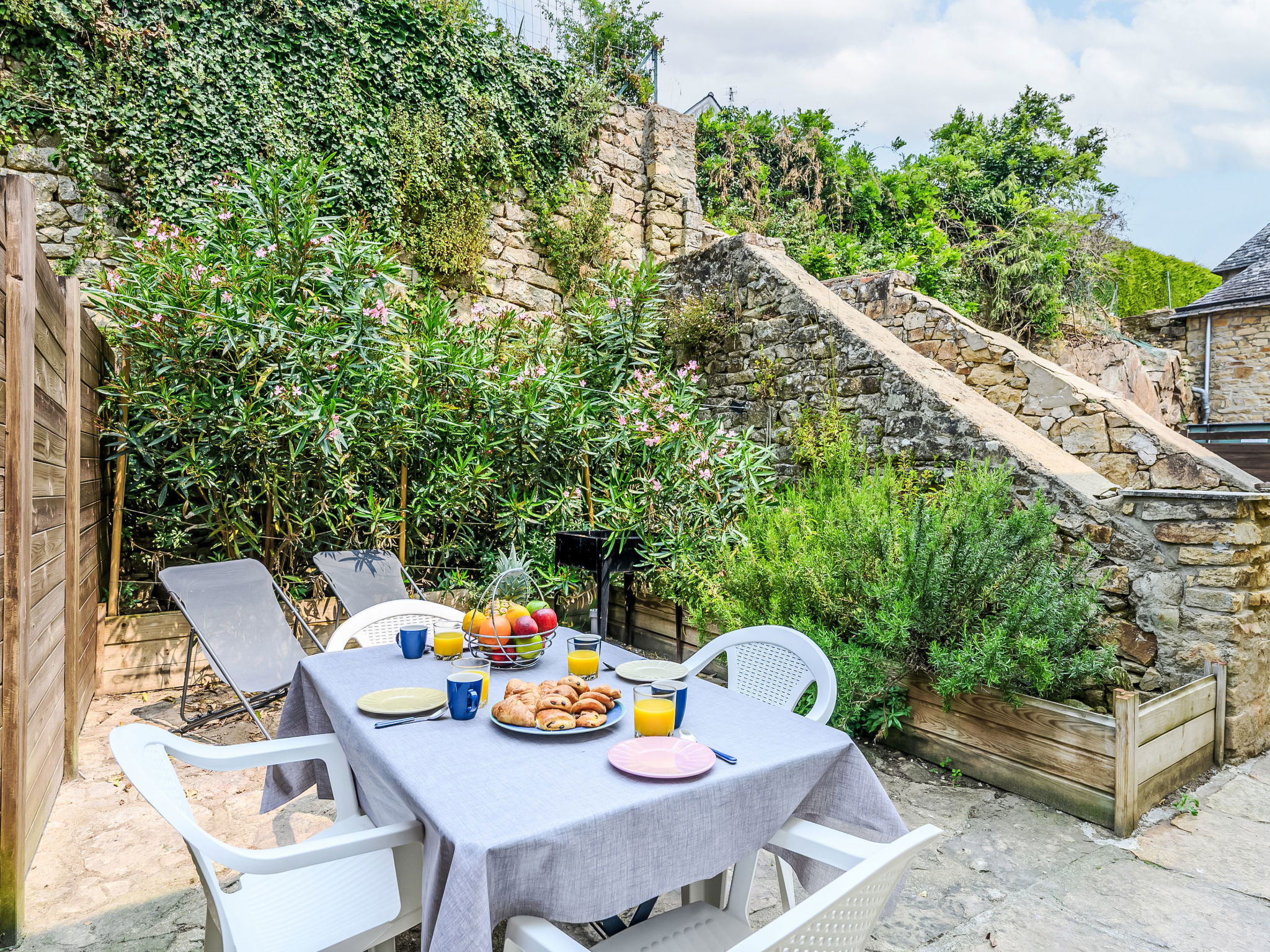 "Les Voiles", 3-room apartment 80 m2, on the ground floor, south facing position. Comfortable furnishings: living/dining room with TV (flat screen). Exit to the terrace. 1 room with 1 french bed (1 x 140 cm, length 190 cm). Exit to the terrace. 1 room with 2 beds (80 cm, length 190 cm), shower. Kitchen (oven, dishwasher, 4 induction hot plates, toaster, kettle, microwave, electric coffee machine). Bathroom, sep. WC. Natural stone floors. Terrace 20 m2, south facing position terrace 25 m2, north facing position. Terrace furniture, barbecue, deck chairs (2). View of the sea. Facilities: washing machine, dryer, hair dryer. Internet (WiFi, free). Please note: no parking. Smoke alarm. Offer by a private individual according to Art. 155, IV of CGI. 5625800012655