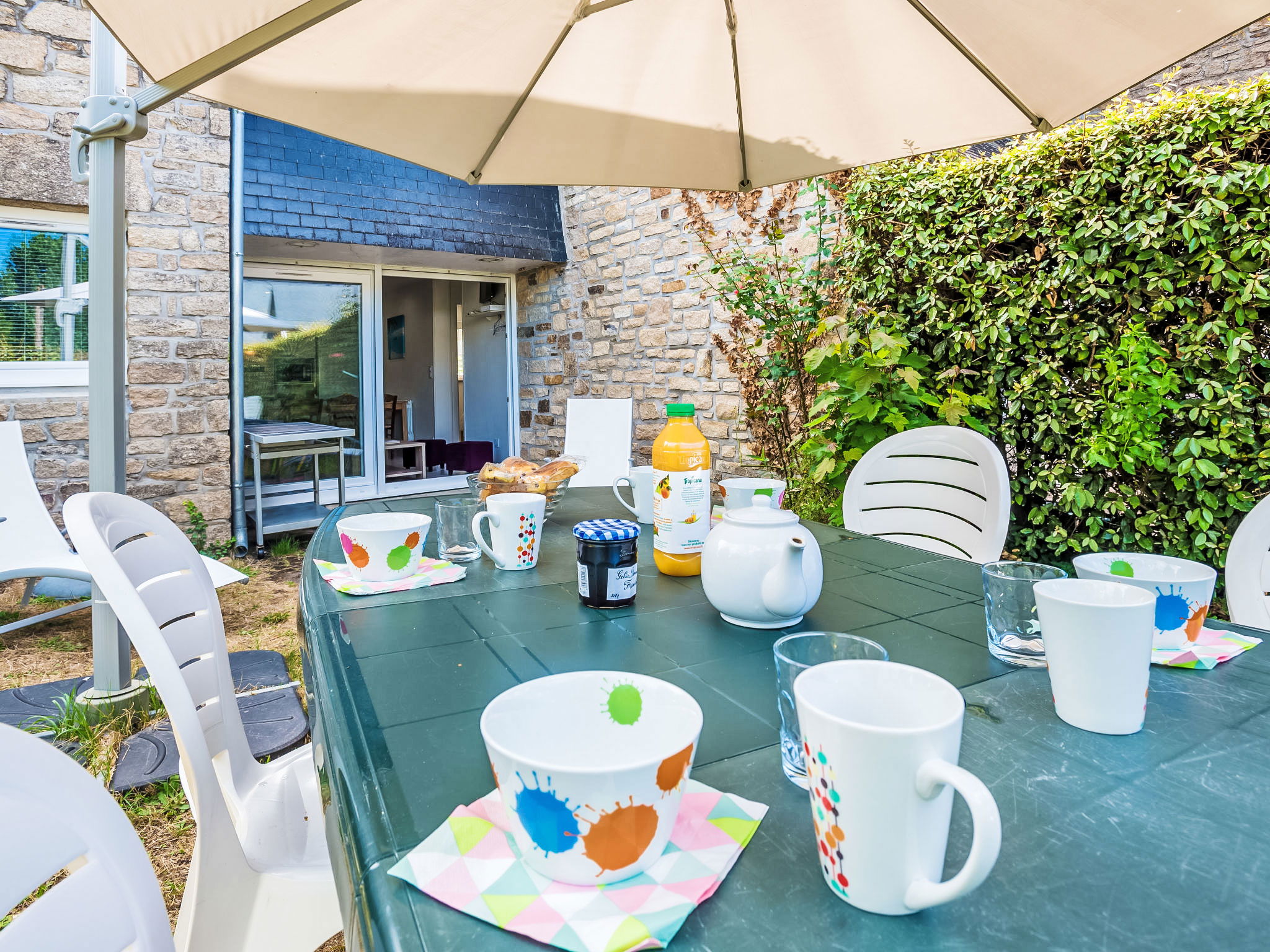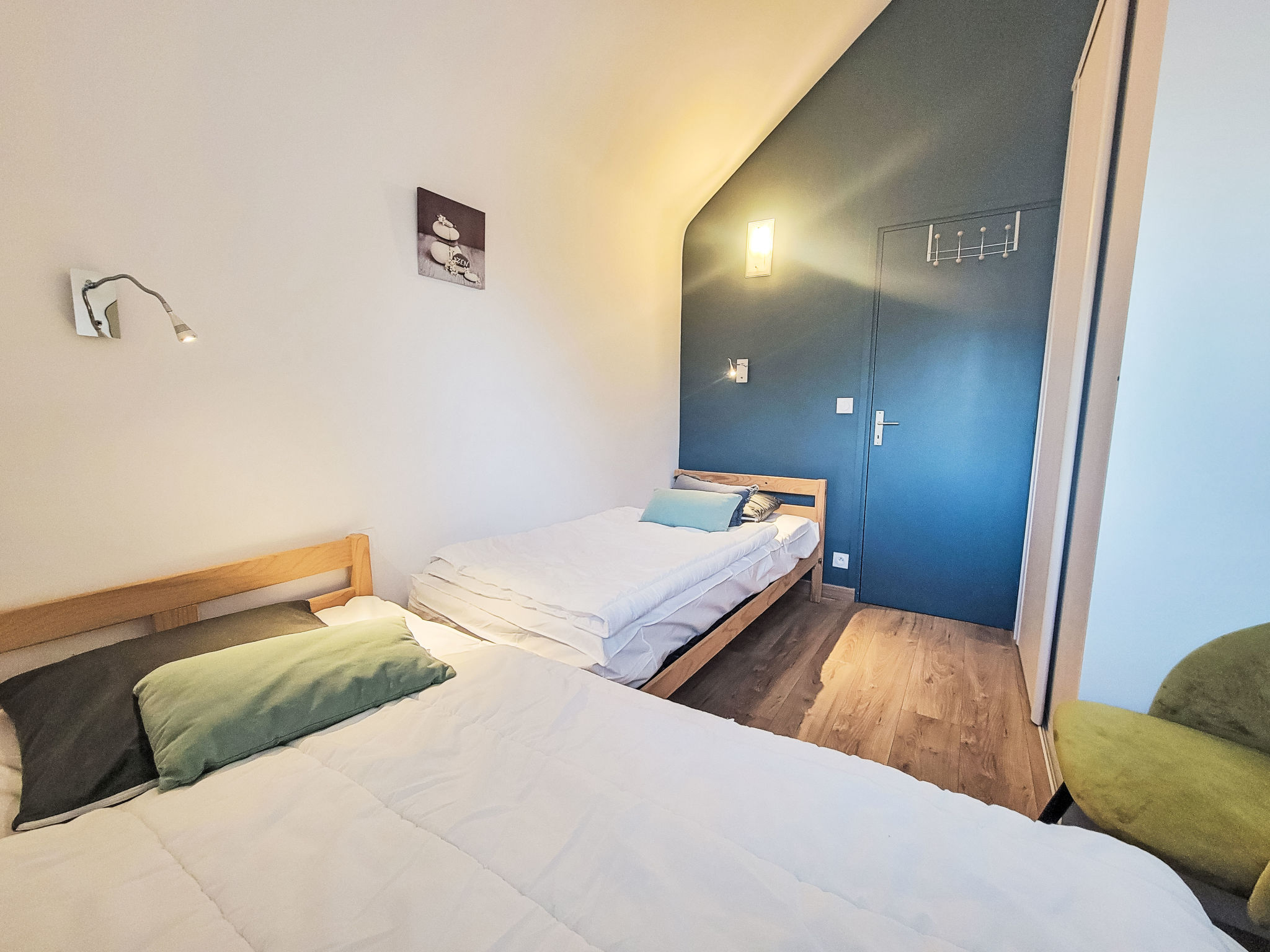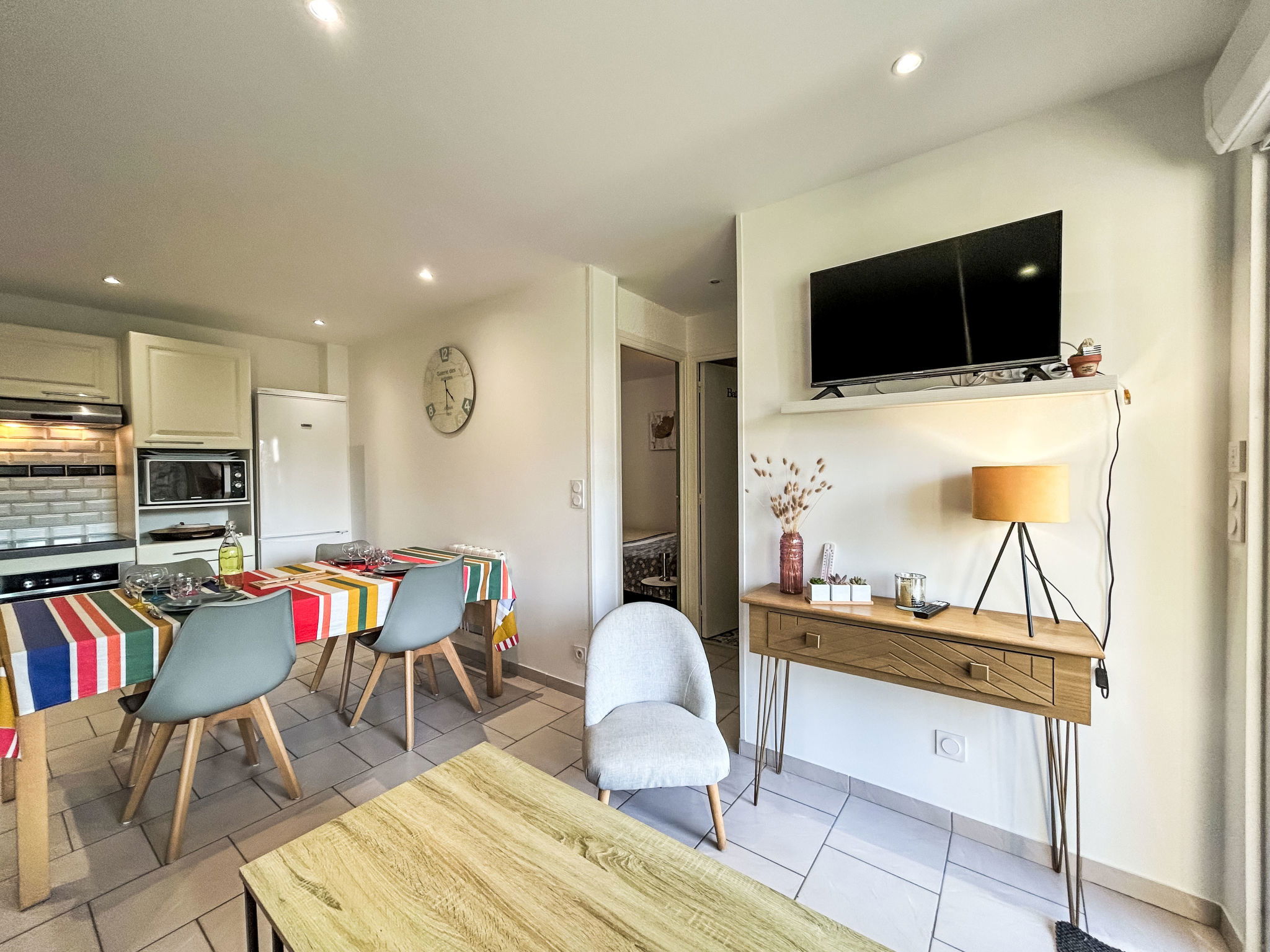 3-room apartment 42 m2, on the ground floor. Renovated in 2017, comfortable and beautiful furnishings: living/dining room with TV (flat screen). Exit to the garden, to the terrace. 1 room with 2 beds (90 cm, length 190 cm). 1 room with 1 french bed (1 x 140 cm, length 190 cm). Open kitchen (oven, dishwasher, 4 induction hot plates, microwave, freezer, electric coffee machine) with dining table. Shower, sep. WC. Electric heating. Terrace 12 m2. Terrace furniture, deck chairs (4). View of the resort. Facilities: washing machine, dryer, iron. Internet (WiFi, free). Parking space n 50 (1 car). Please note: smoke alarm. Plancha available. 56258 000153 4O