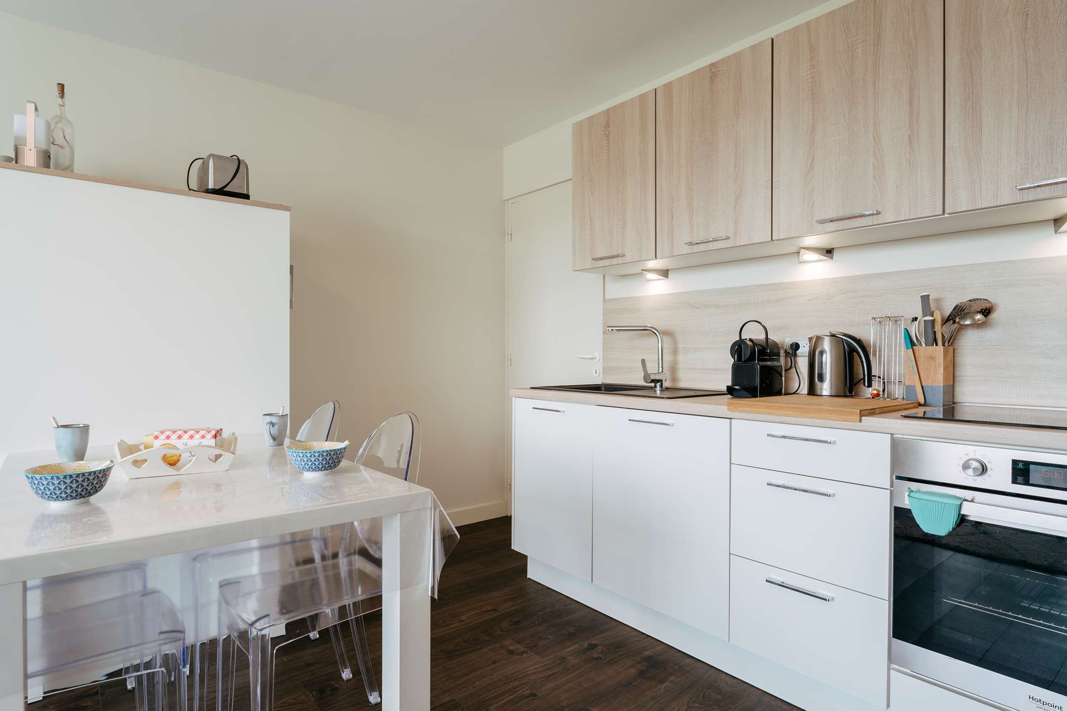 - Equipped kitchen area (2-ring induction hob, oven, fridge/freezer, dishwasher, washing machine, Nespresso coffee machine)