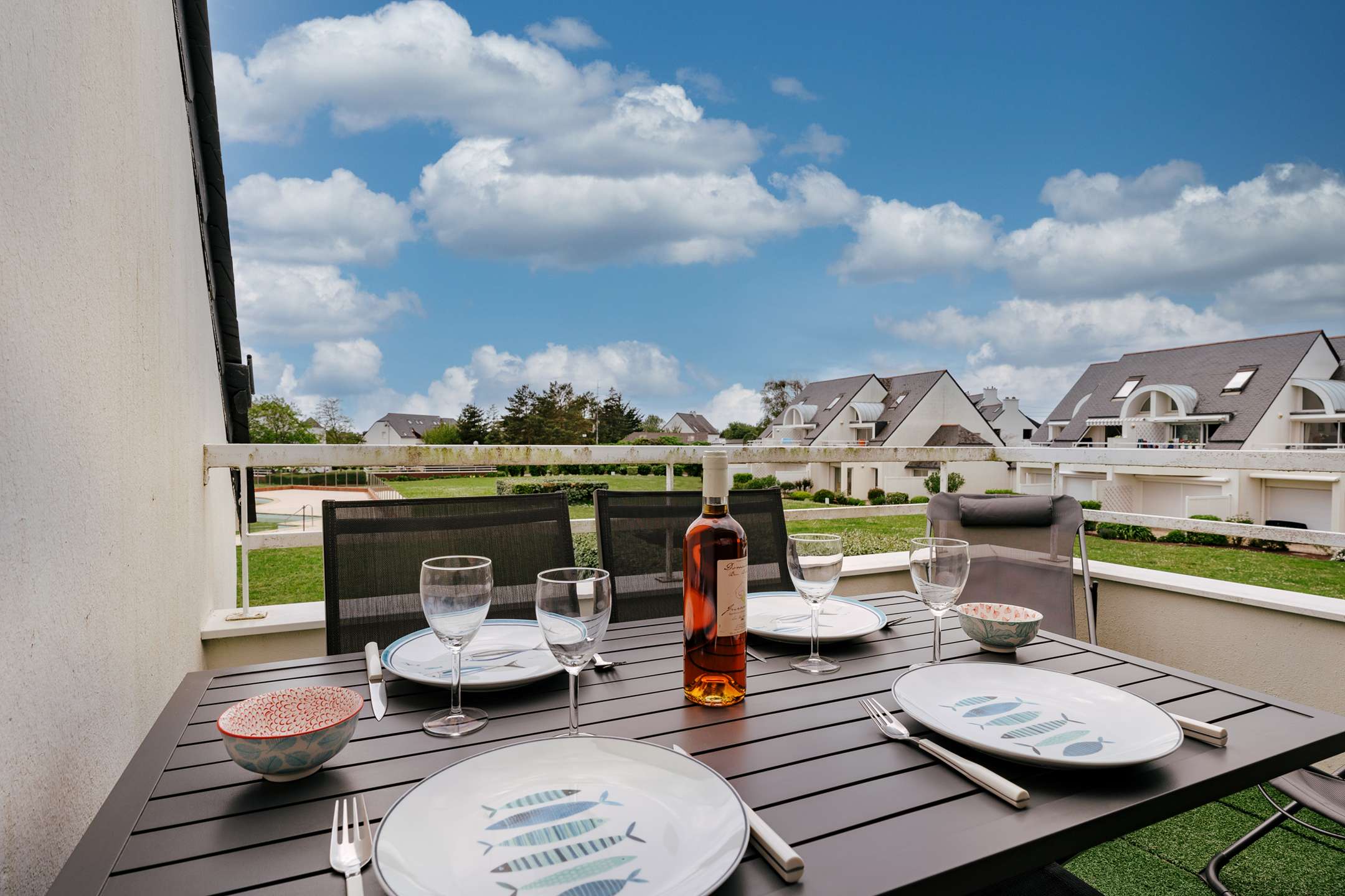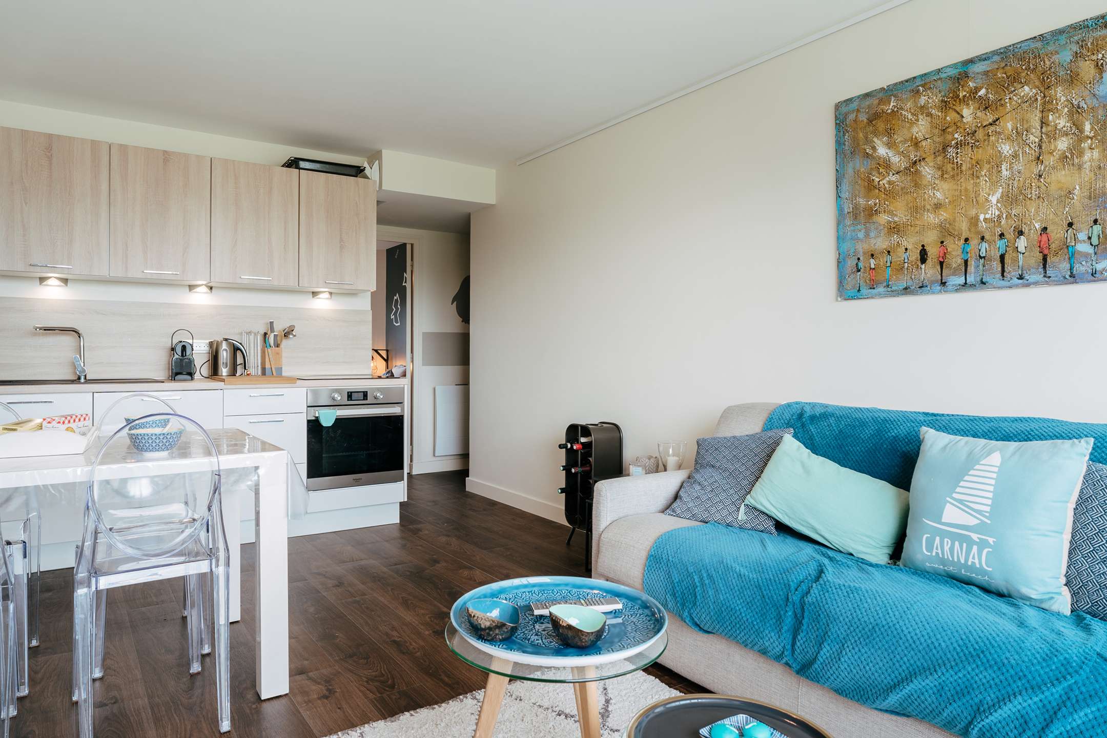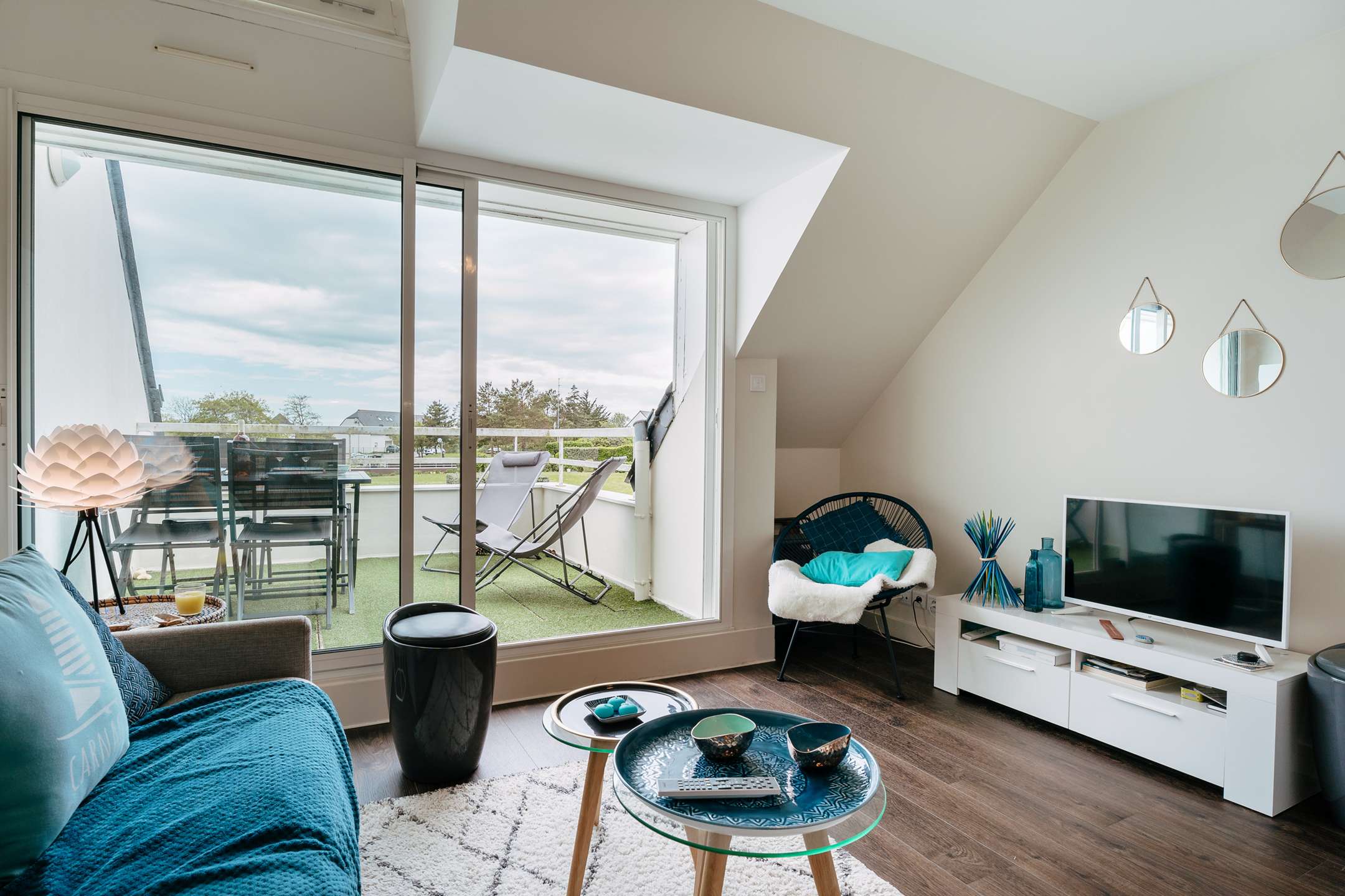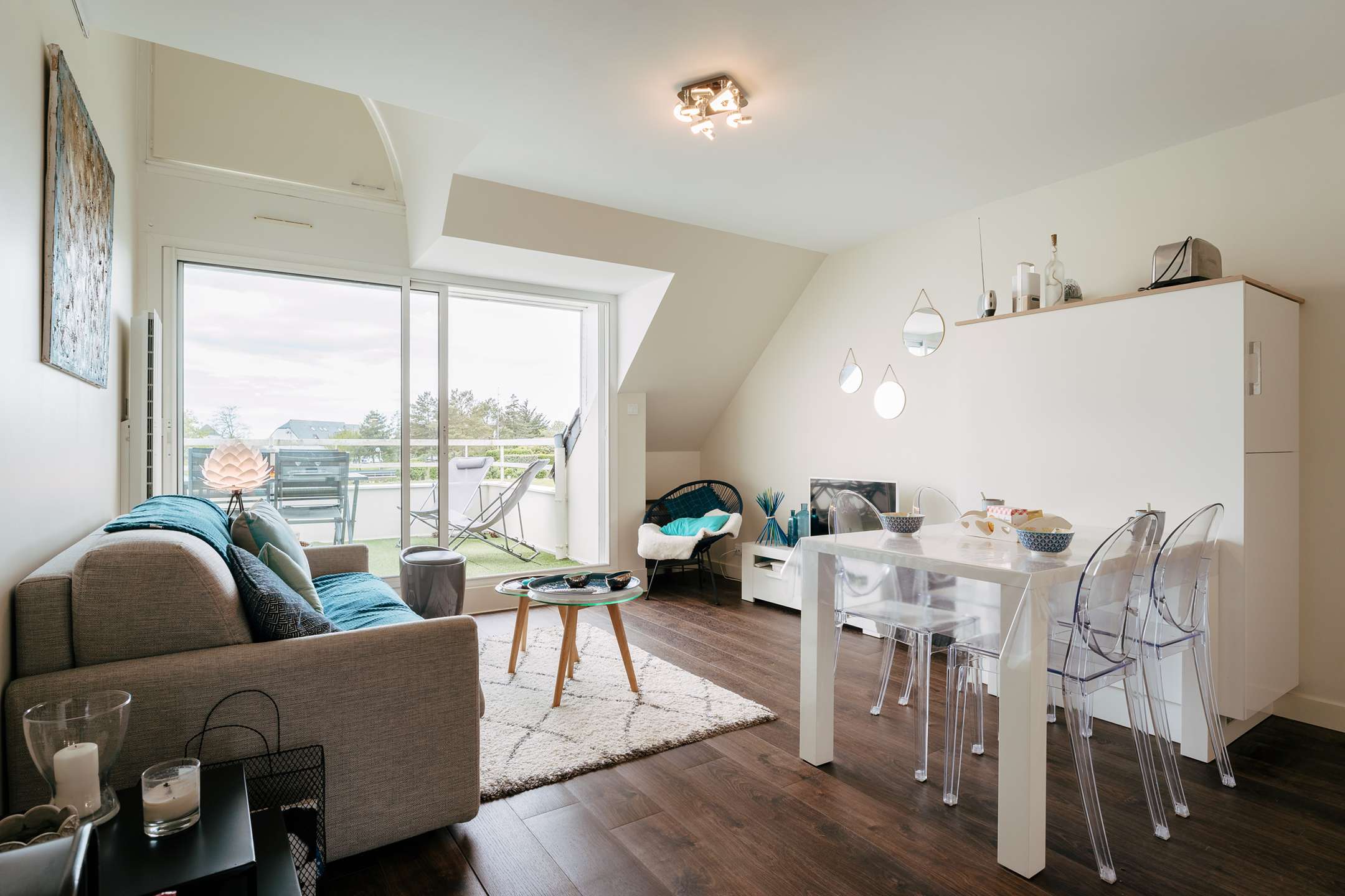 - Living room with dining area (table and chairs) and lounge area (TV, double sofa : bed, duvet) opening onto south-facing balcony with view of the swimming pool and the garden of the residence