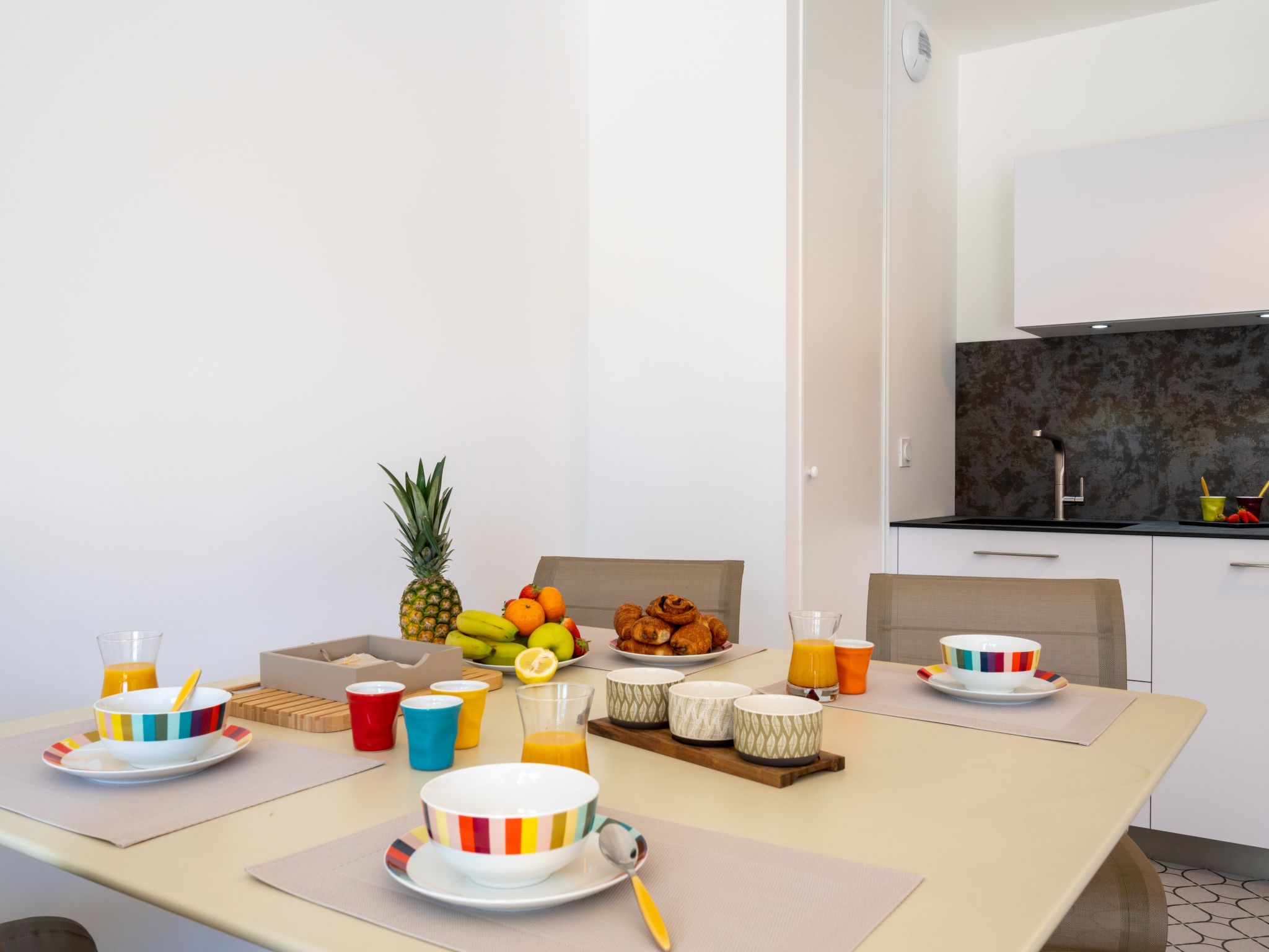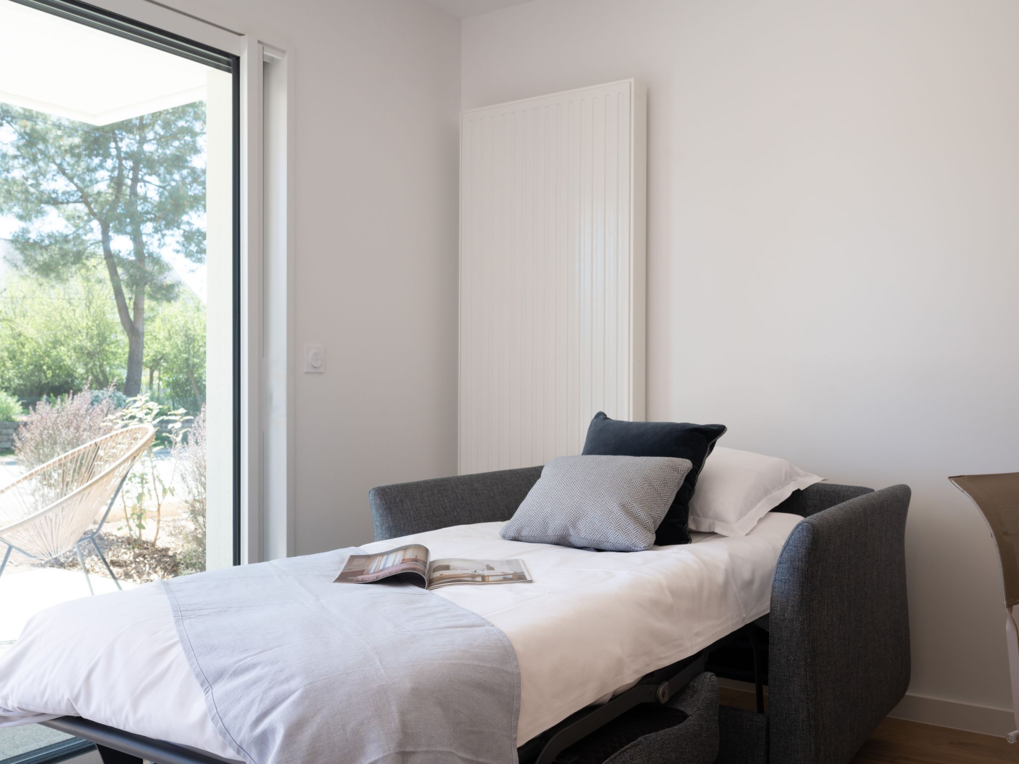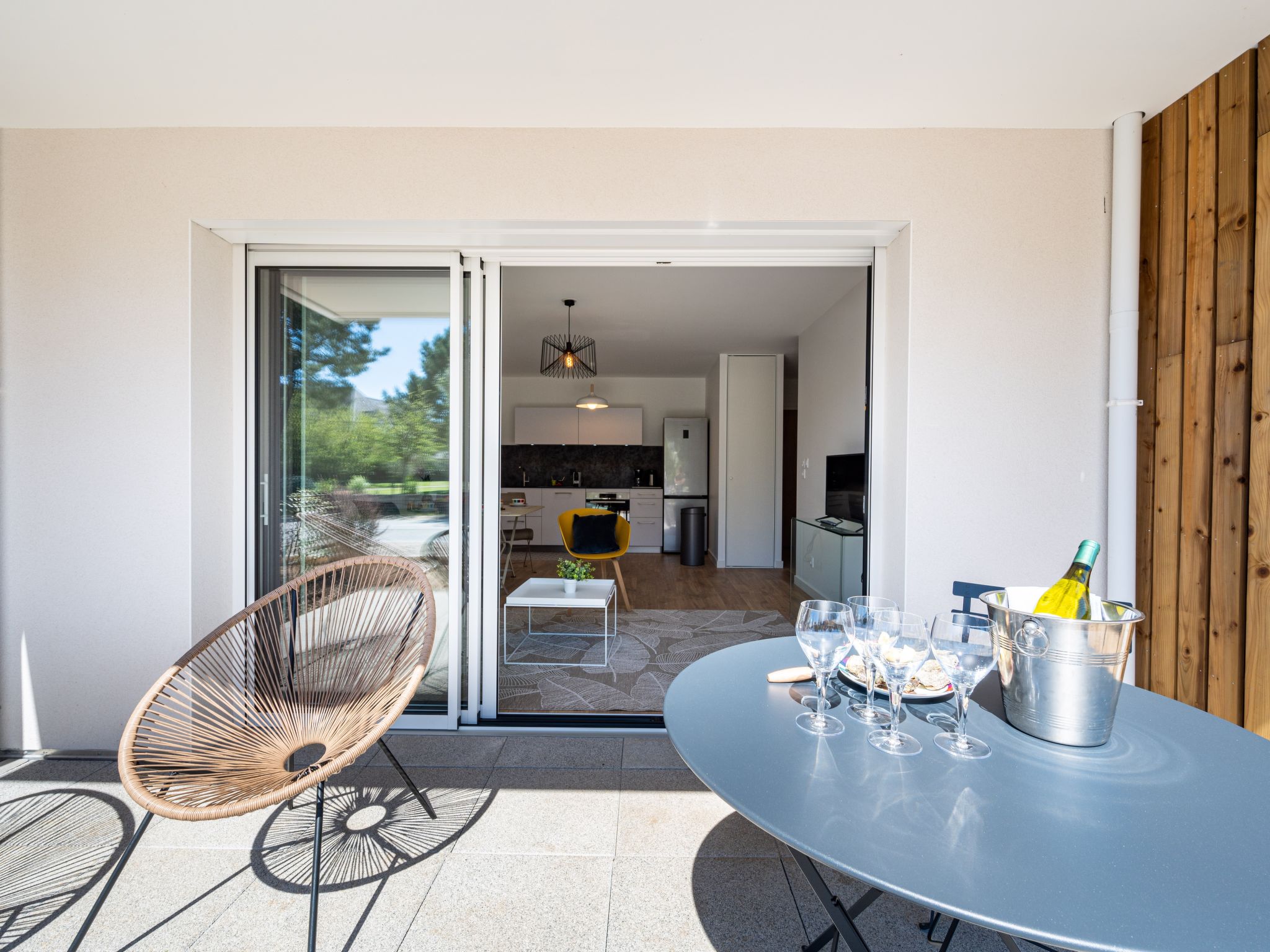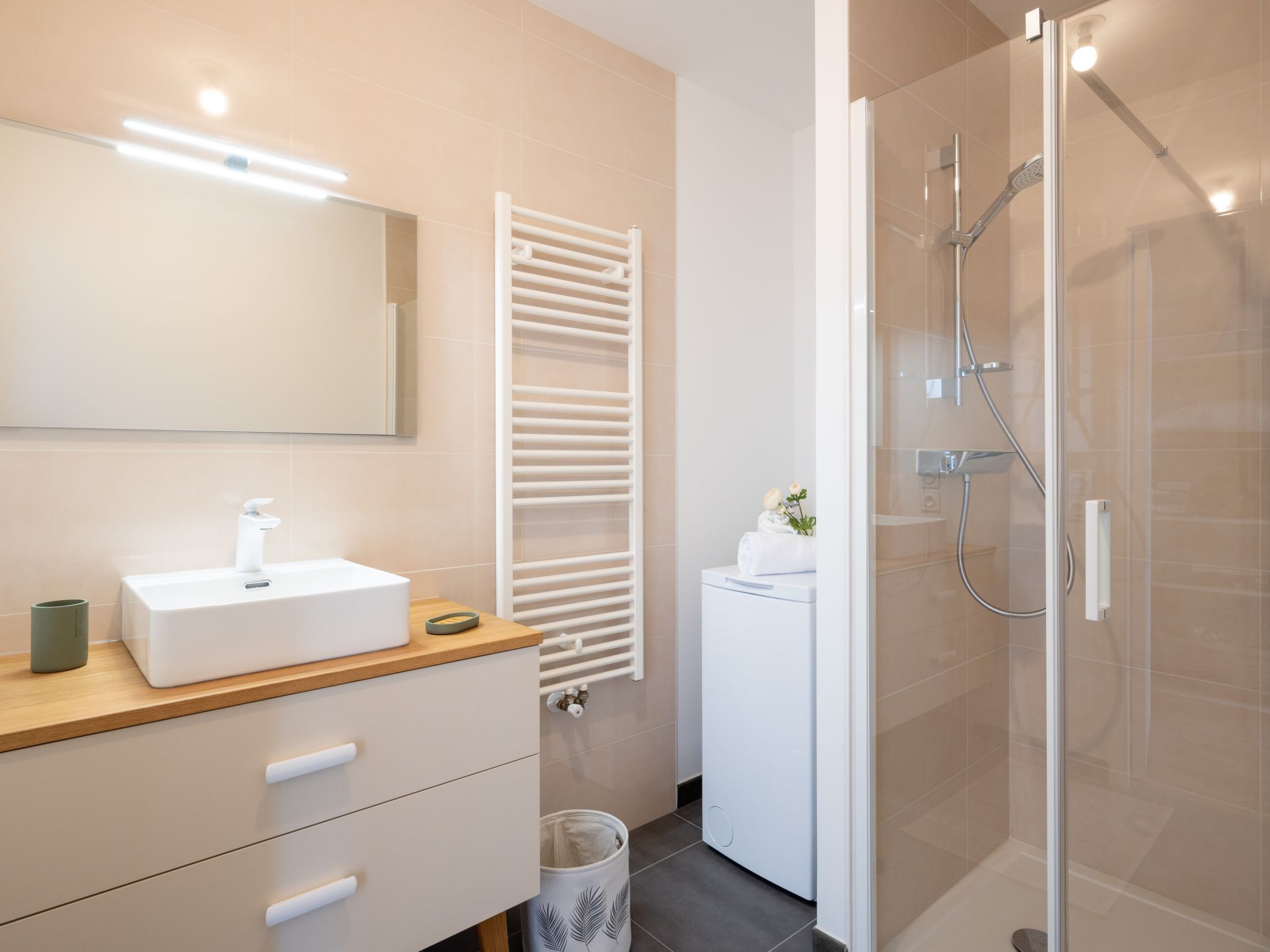2-room apartment 48 m2, on the ground floor, south facing position. Spacious, very comfortable and modern furnishings: living/dining room with 1 sofabed (80 cm, length 190 cm), TV (flat screen). Exit to the terrace, to the patio. 1 room with 2 beds (90 cm, length 200 cm). Open kitchen (oven, dishwasher, 3 induction hot plates, toaster, kettle, electric coffee machine, Capsules for coffee machine (NESPRESSO) extra). Shower, sep. WC. Terrace 10 m2, patio 15 m2, south facing position. Terrace furniture. Facilities: washing machine, hair dryer. Internet (WiFi, free). Reserved parking space n 5. Please note: smoke alarm. Garden in progress.