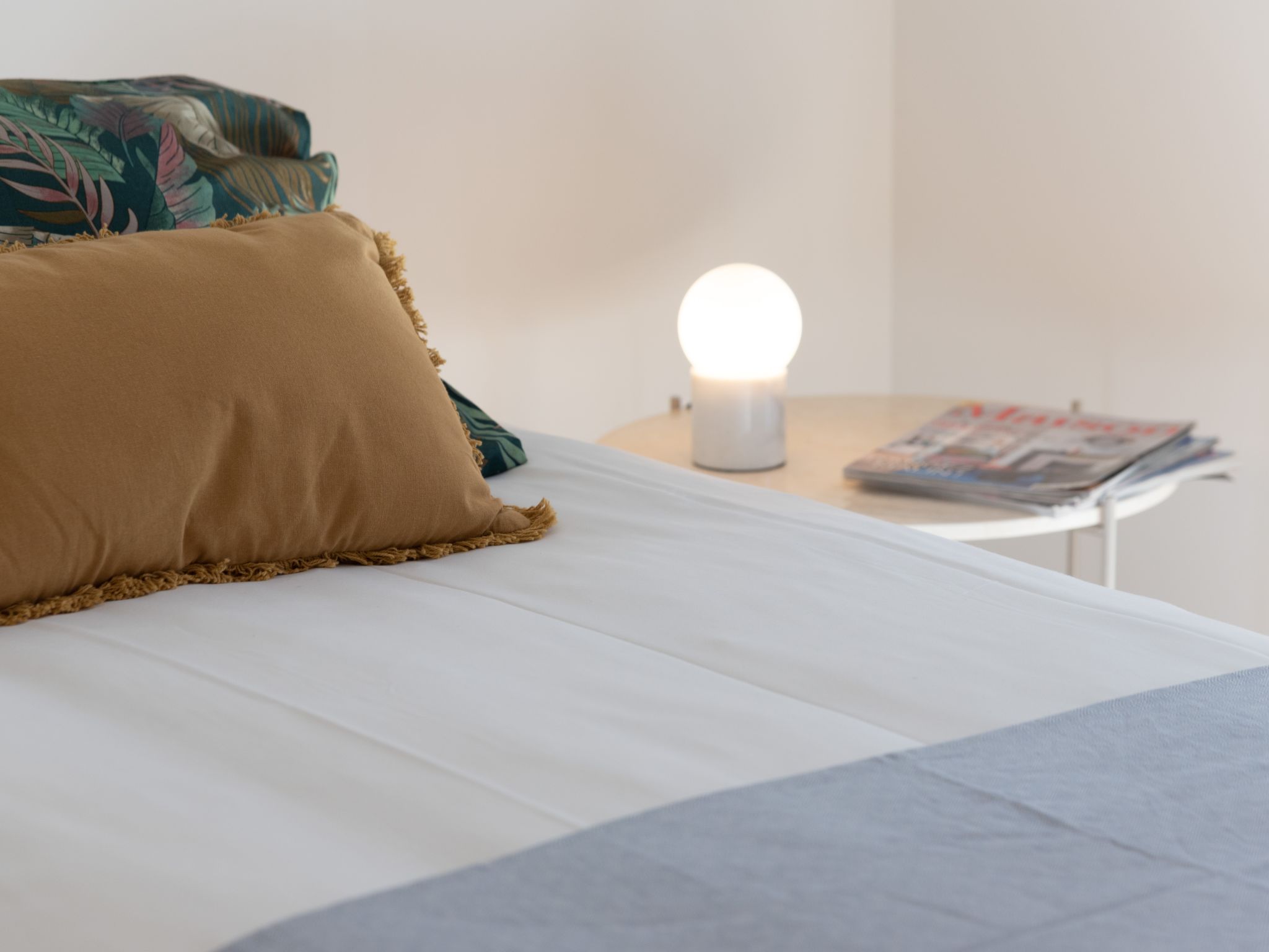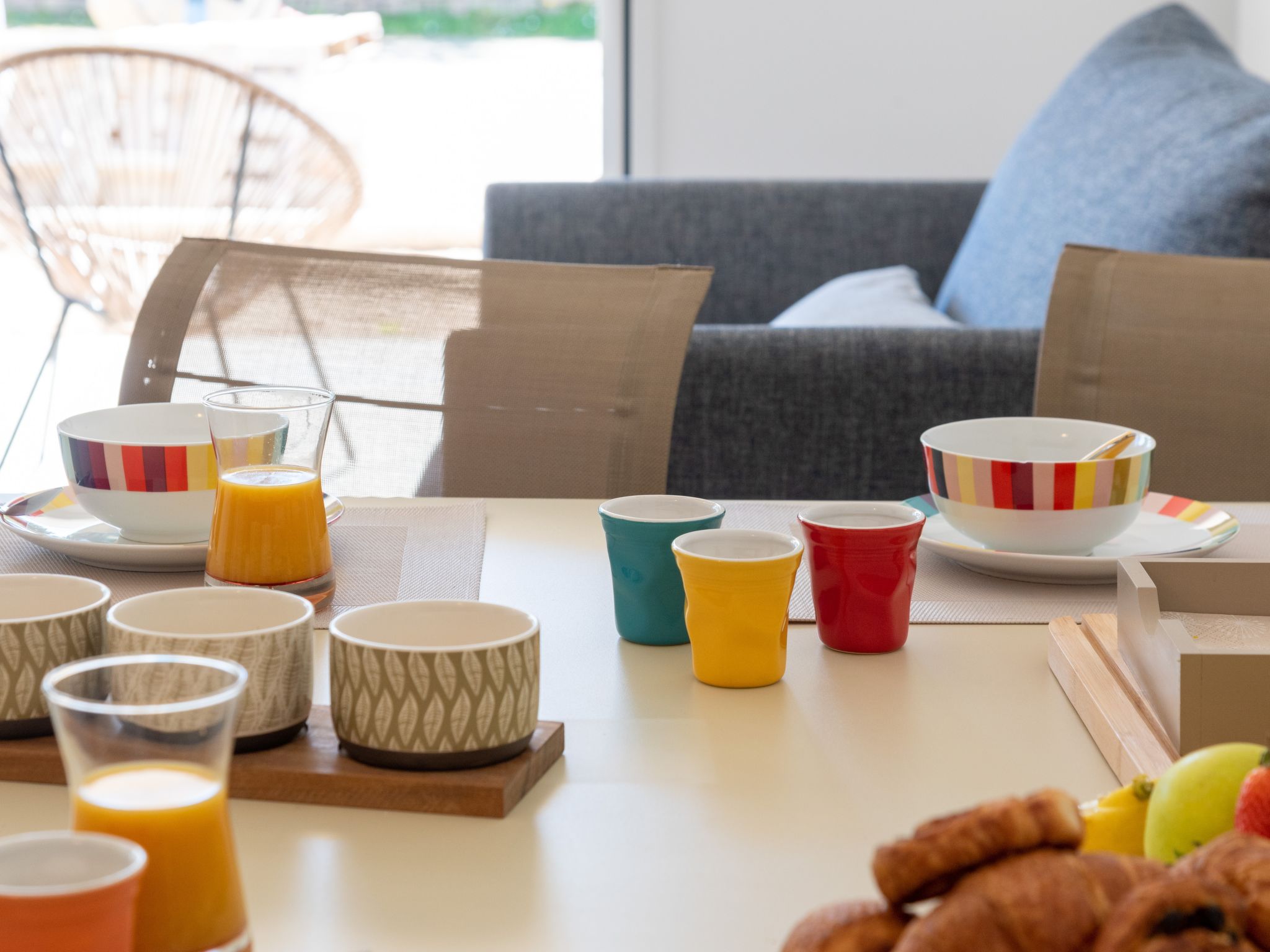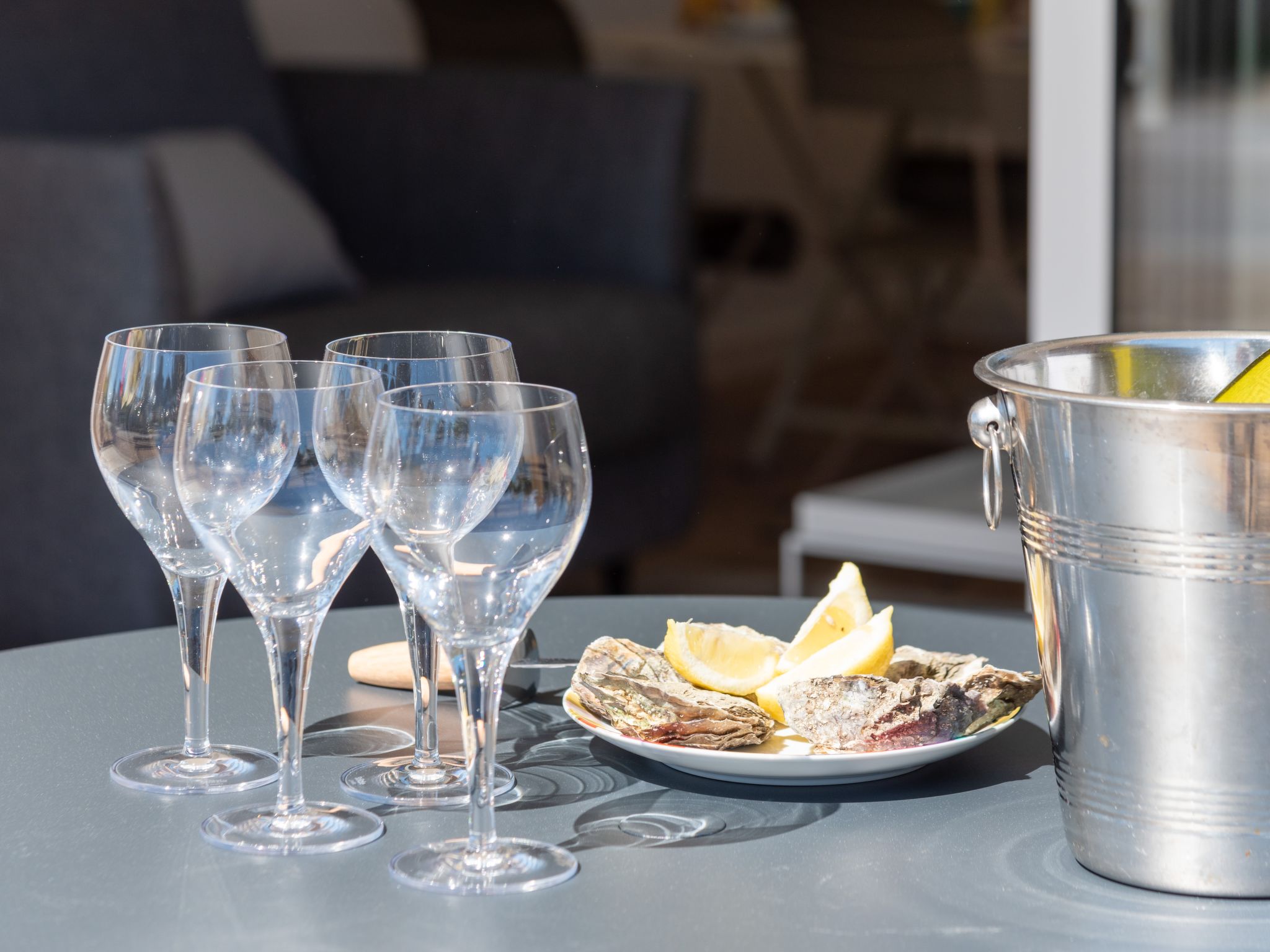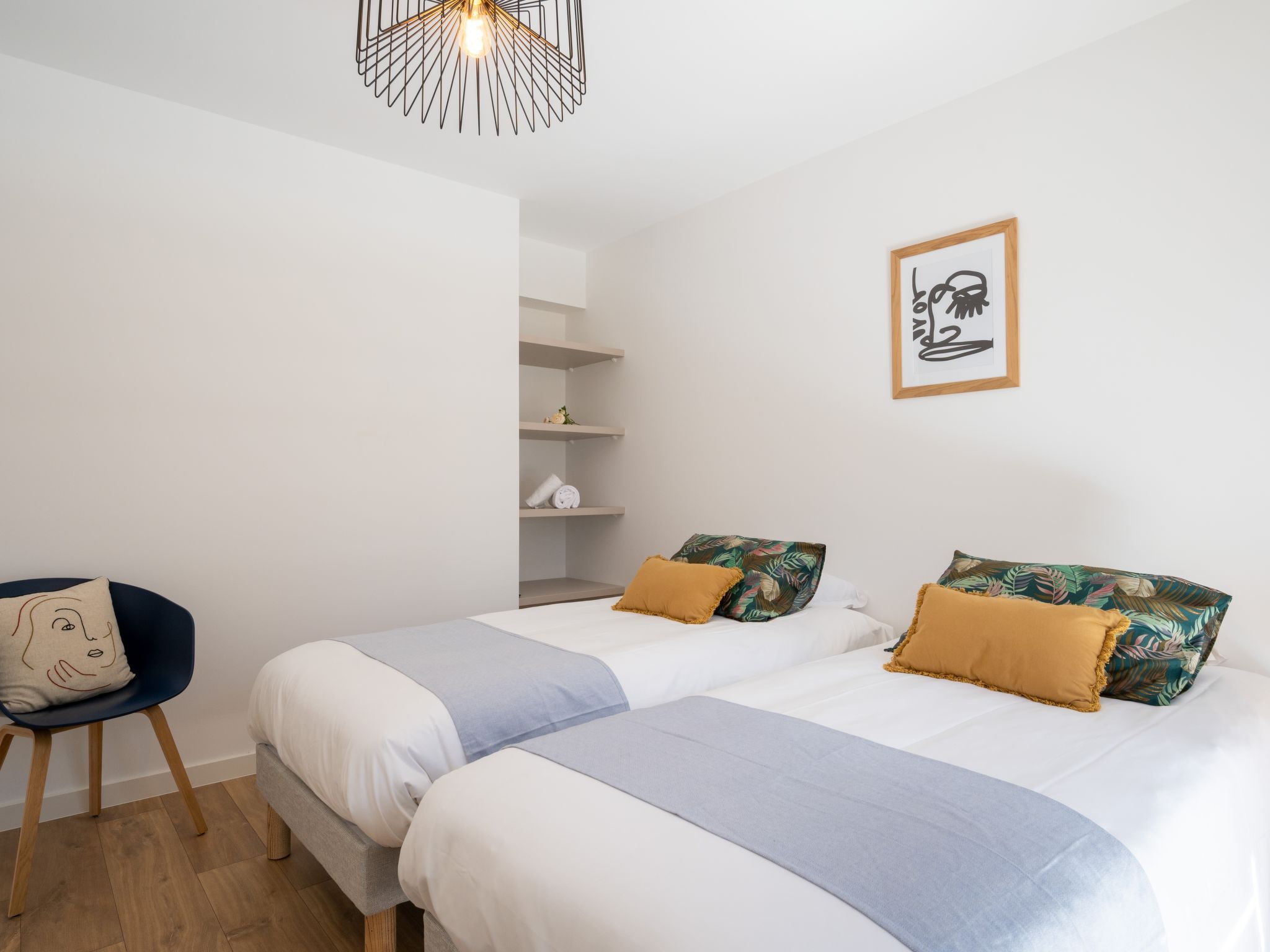 2-room apartment 48 m2, on the ground floor, south facing position. Spacious, very comfortable and modern furnishings: living/dining room with 1 sofabed (80 cm, length 190 cm), TV (flat screen). Exit to the terrace, to the patio. 1 room with 2 beds (90 cm, length 200 cm). Open kitchen (oven, dishwasher, 3 induction hot plates, toaster, kettle, electric coffee machine, Capsules for coffee machine (NESPRESSO) extra). Shower, sep. WC. Terrace 10 m2, patio 15 m2, south facing position. Terrace furniture. Facilities: washing machine, hair dryer. Internet (WiFi, free). Reserved parking space n 5. Please note: smoke alarm. Garden in progress.