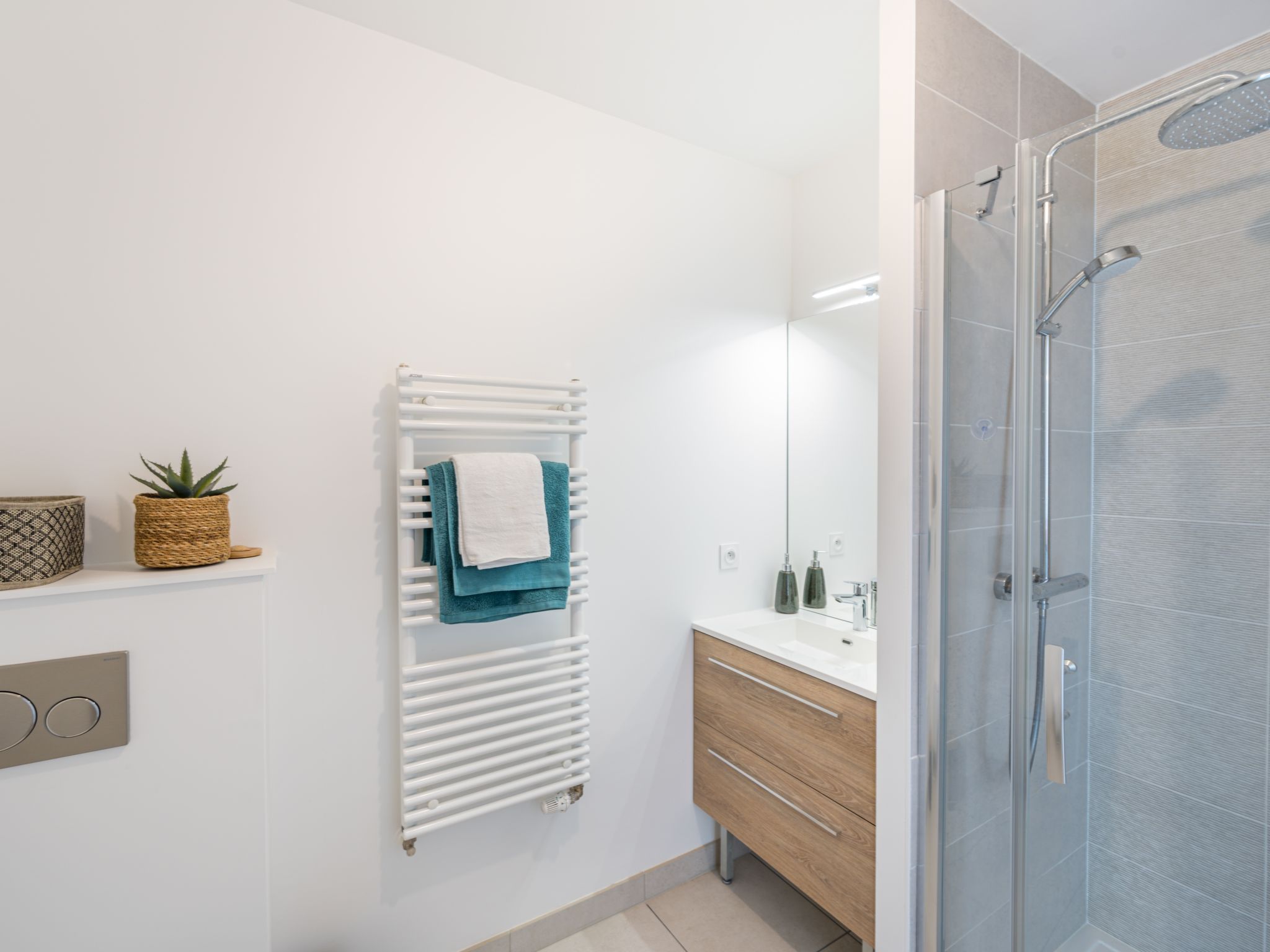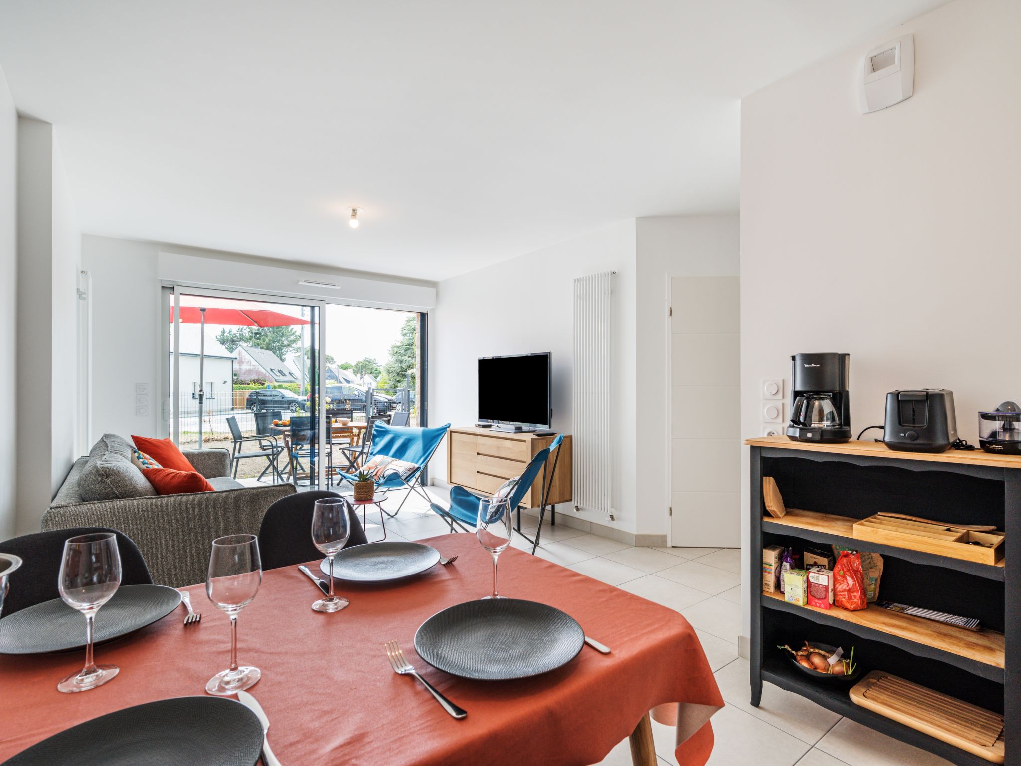 Modern apartment block "Les Villas du Men Du", 2 storeys, built in 2022. In the resort, 300 m from the sea, from the beach. In the house: storage room for bicycles. Supermarket 200 m, restaurant 500 m, bar, bakery 1 km, café, bicycle rental 1 km, sandy beach "Plage du Men Du" 300 m, thermal baths "Thalassothérapie Thalazur" 2 km. Golf course (18 hole) 15 km, surf school 6 km, sailing school 2 km. Nearby attractions: Les Alignements de Carnac 5 km, La Trinité sur Mer 5 km, Presqu'ile de Quiberon 15 km, Vannes 30 km, Lorient 40 km, Belle Ile en Mer, Houat, Hoedic. Hiking paths: Le Golfe du Morbihan 30 km.
