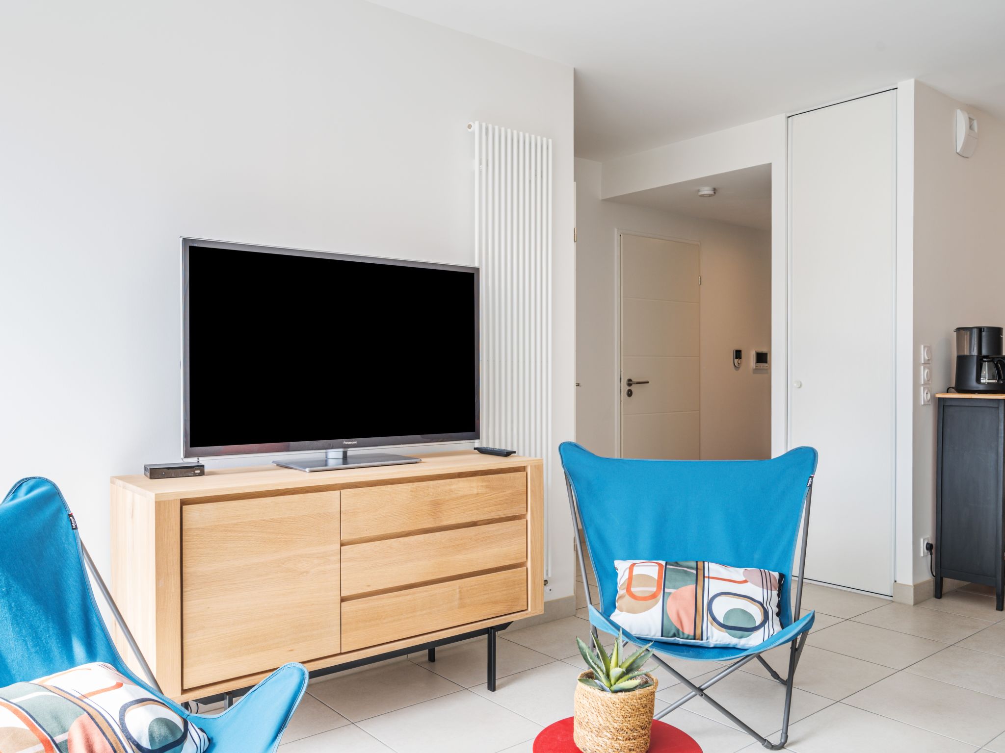 2-room apartment 42 m2, on the ground floor. Comfortable and modern furnishings: living/dining room with 1 double sofabed (1 x 140 cm, length 190 cm), TV (flat screen). Exit to the patio. 1 room with 1 french bed (1 x 160 cm, length 190 cm). Open kitchen (dishwasher, 2 induction hot plates, toaster, kettle, electric coffee machine, Capsules for coffee machine (Senseo) extra, combination microwave). Shower/WC. Terrace 7 m2, patio 43 m2. Terrace furniture, deck chairs (2). Facilities: washing machine. Internet (WiFi, free). Parking space n 9. Please note: smoke alarm. 5603400047019