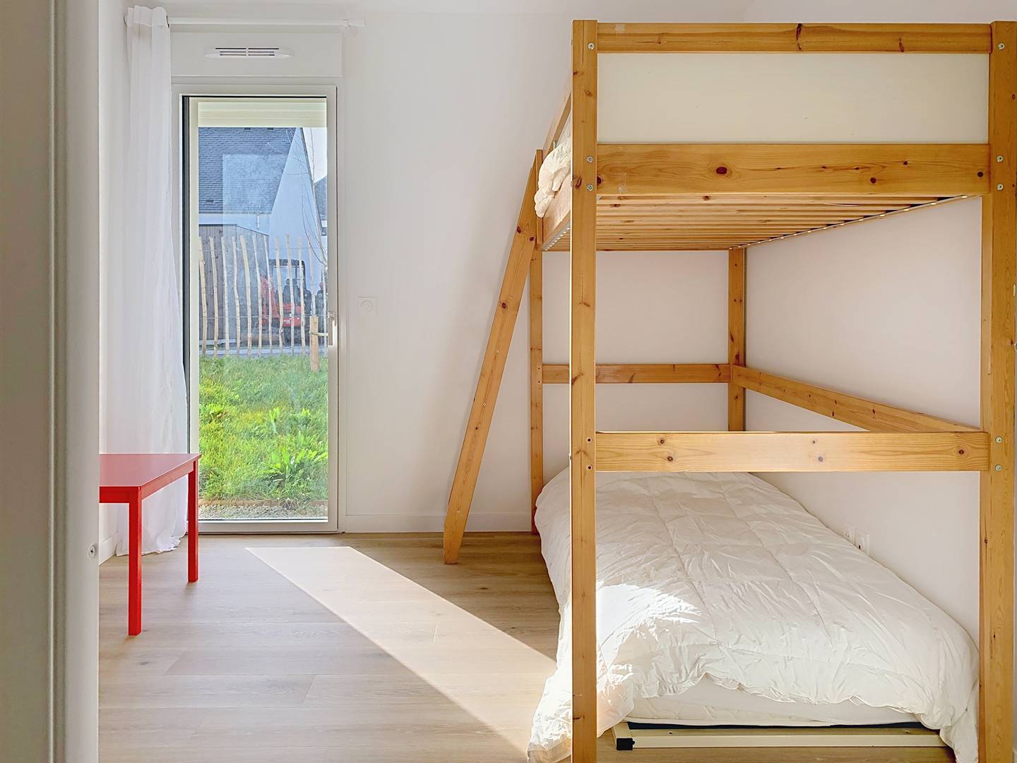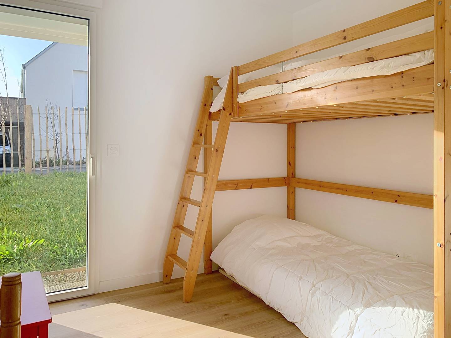 - 1 bedroom with bunk beds (90 cm, duvets) and direct access to the garden