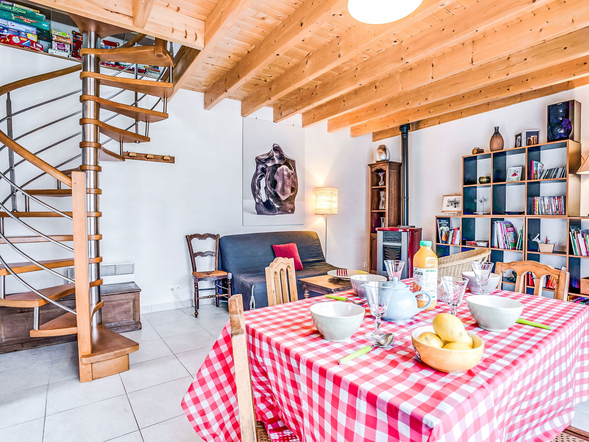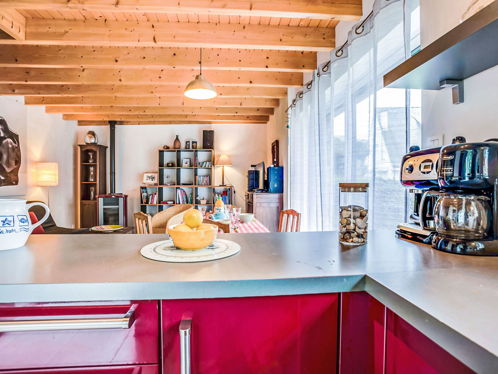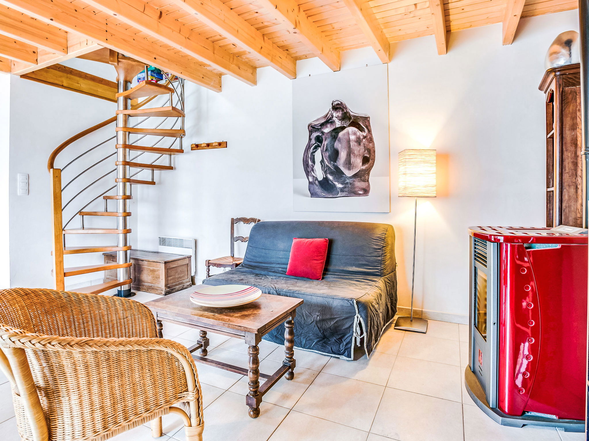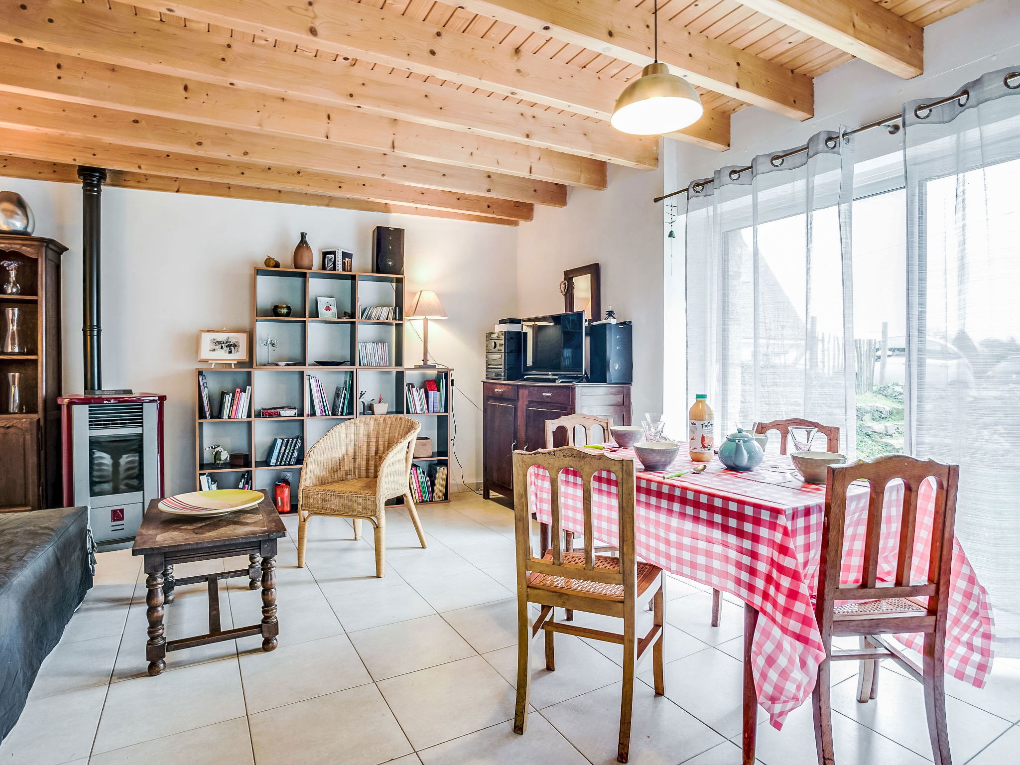 3-room house 50 m2 on 2 levels. Object suitable for 2 adults + 2 children. Living/dining room with hi-fi system and wood-burning stove. Exit to the garden. Open kitchen (3 hot plates, dishwasher, freezer, electric coffee machine, combination microwave). Upper floor: (spiral staircase), 1 room with 1 french bed (140 cm, length 190 cm), TV and DVD. 1 children's room with sloping ceilings with 1 pull-out bed (2 pers. 2 x 90 cm, length 190 cm). Shower/WC. Terrace furniture, barbecue, deck chairs (2). Facilities: washing machine, children's high chair, baby cot. Internet (WiFi, free). Please note: smoke alarm. 56034000805A8