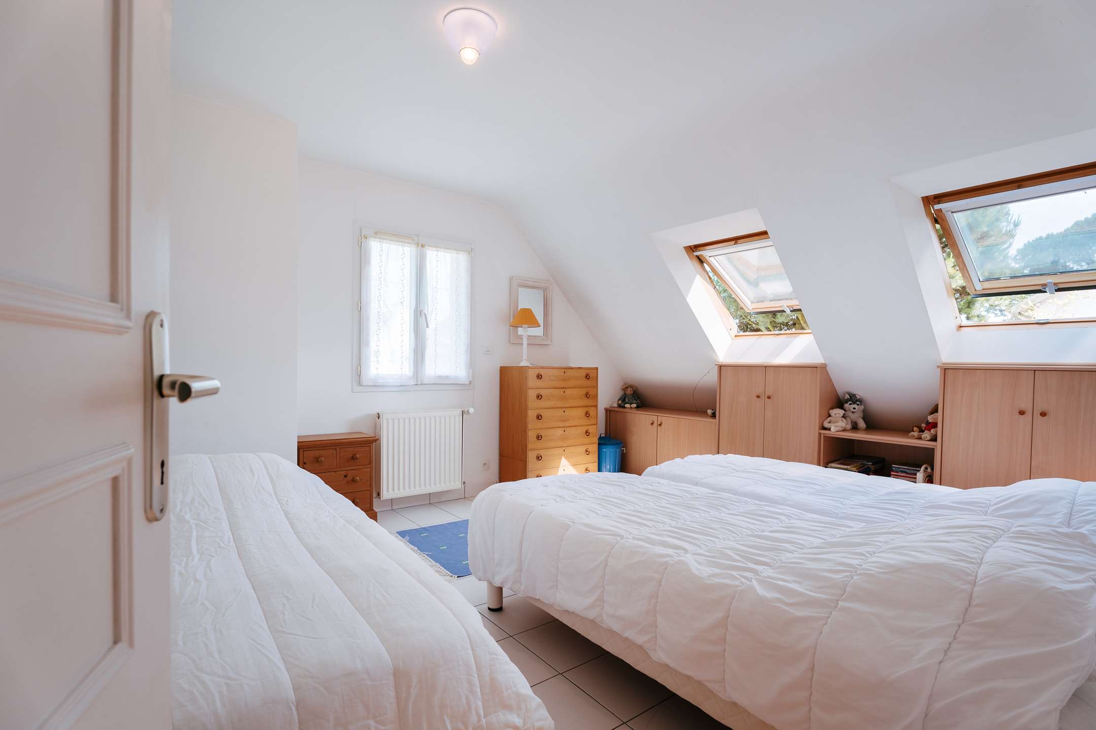- 1 bedroom with 2 single beds (90, duvets) and storage