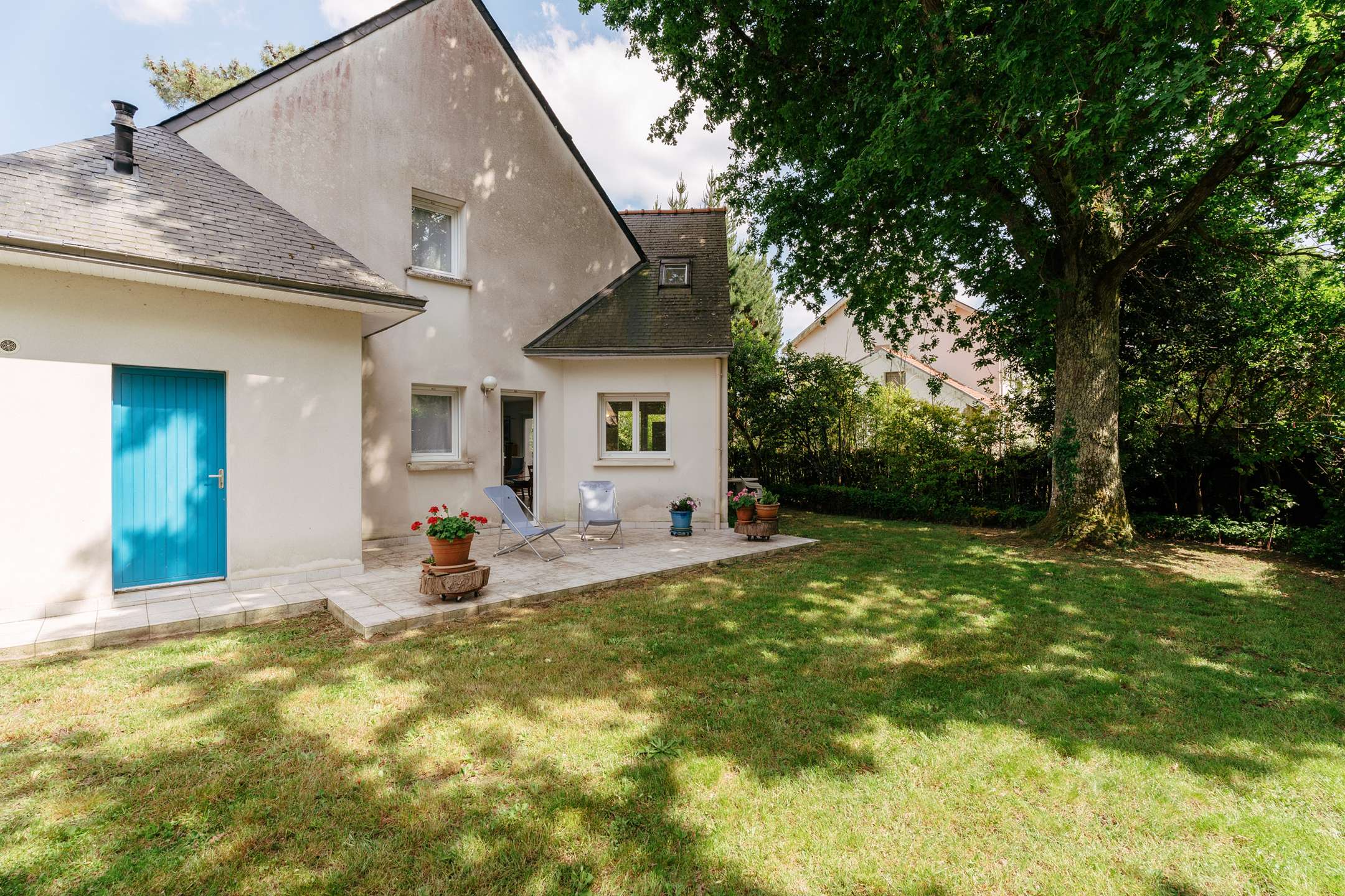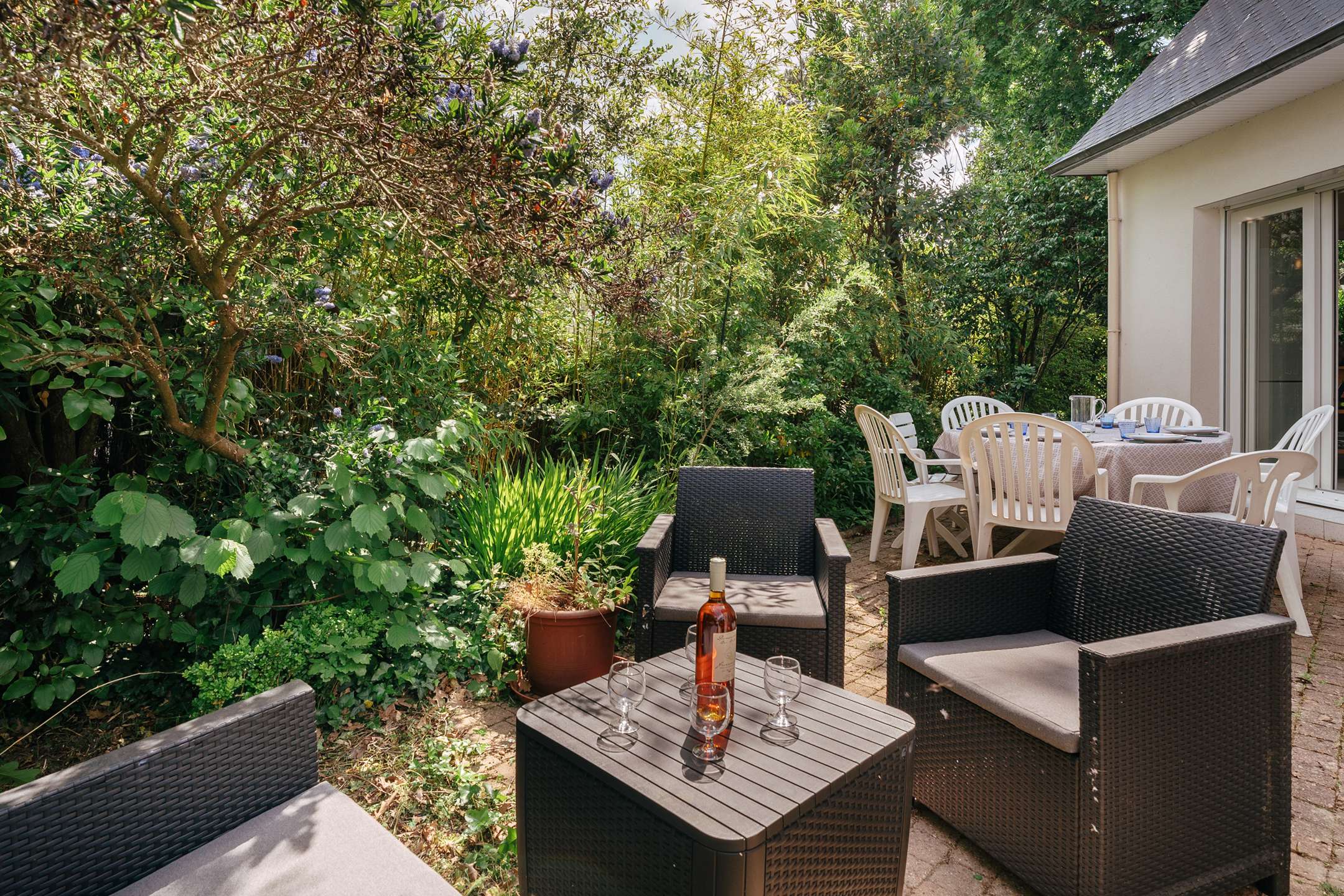 - Living room with lounge area (TV, sofas, armchairs) opening onto the south-facing terrace (garden furniture, electric awning) extended by the enclosed garden