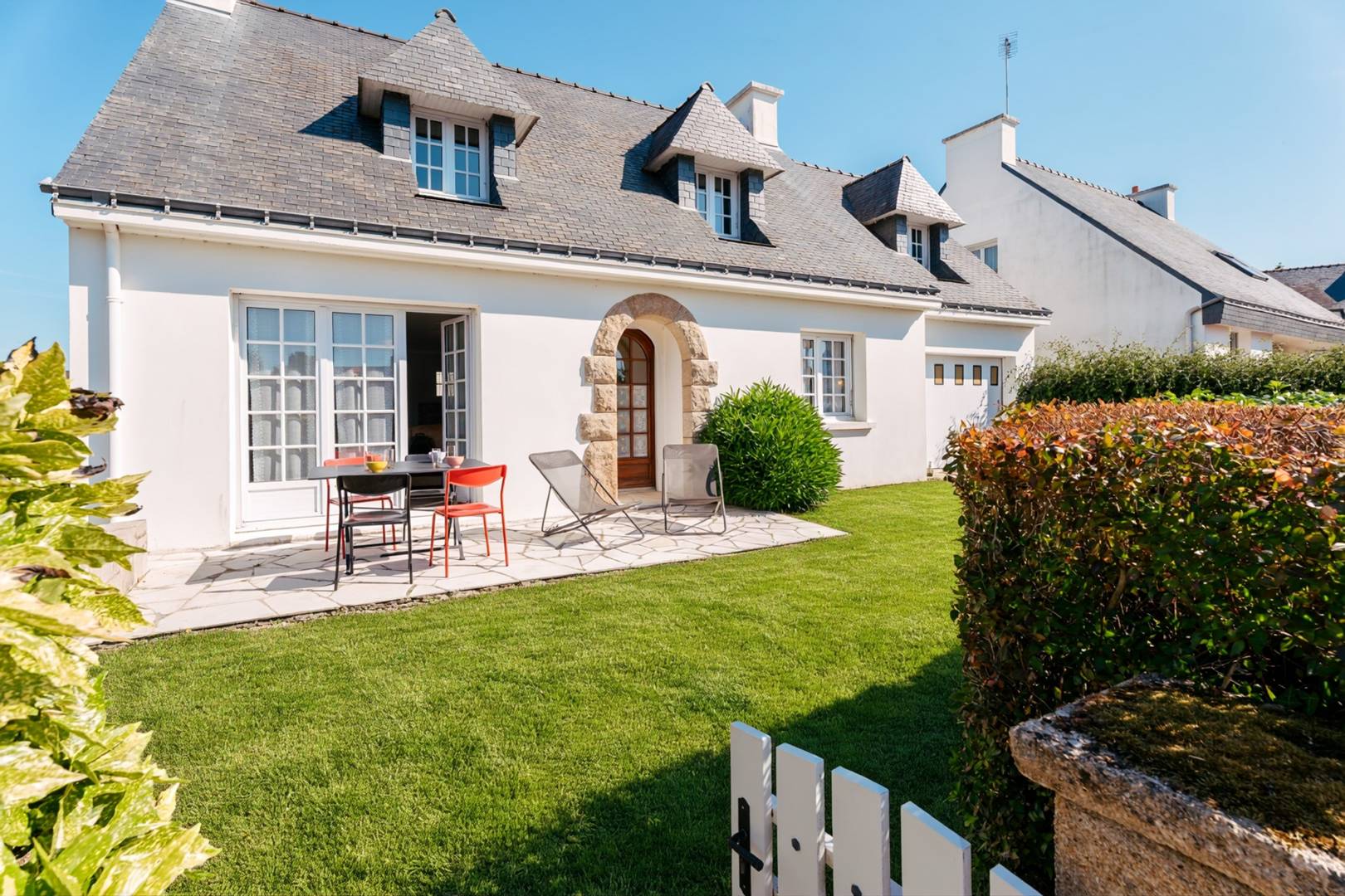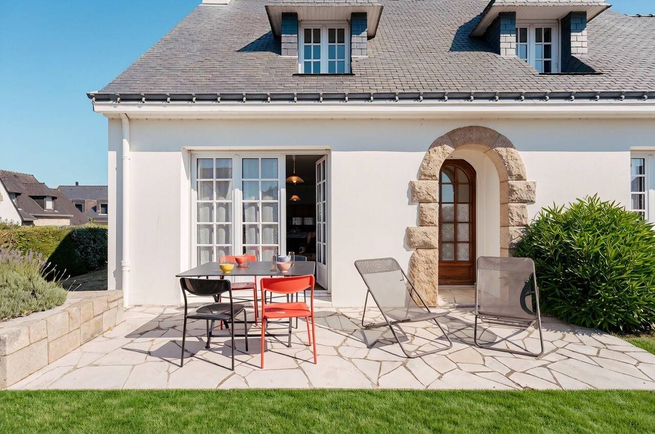 1 km from the centre of Carnac and 2.5 km from the Grande Plage, 6-room neo-Breton style house (approx. 106 m²) for 9 people with enclosed garden, peacefully situated in the “Clos de Kervégan” residential development :