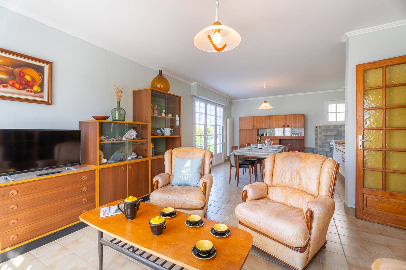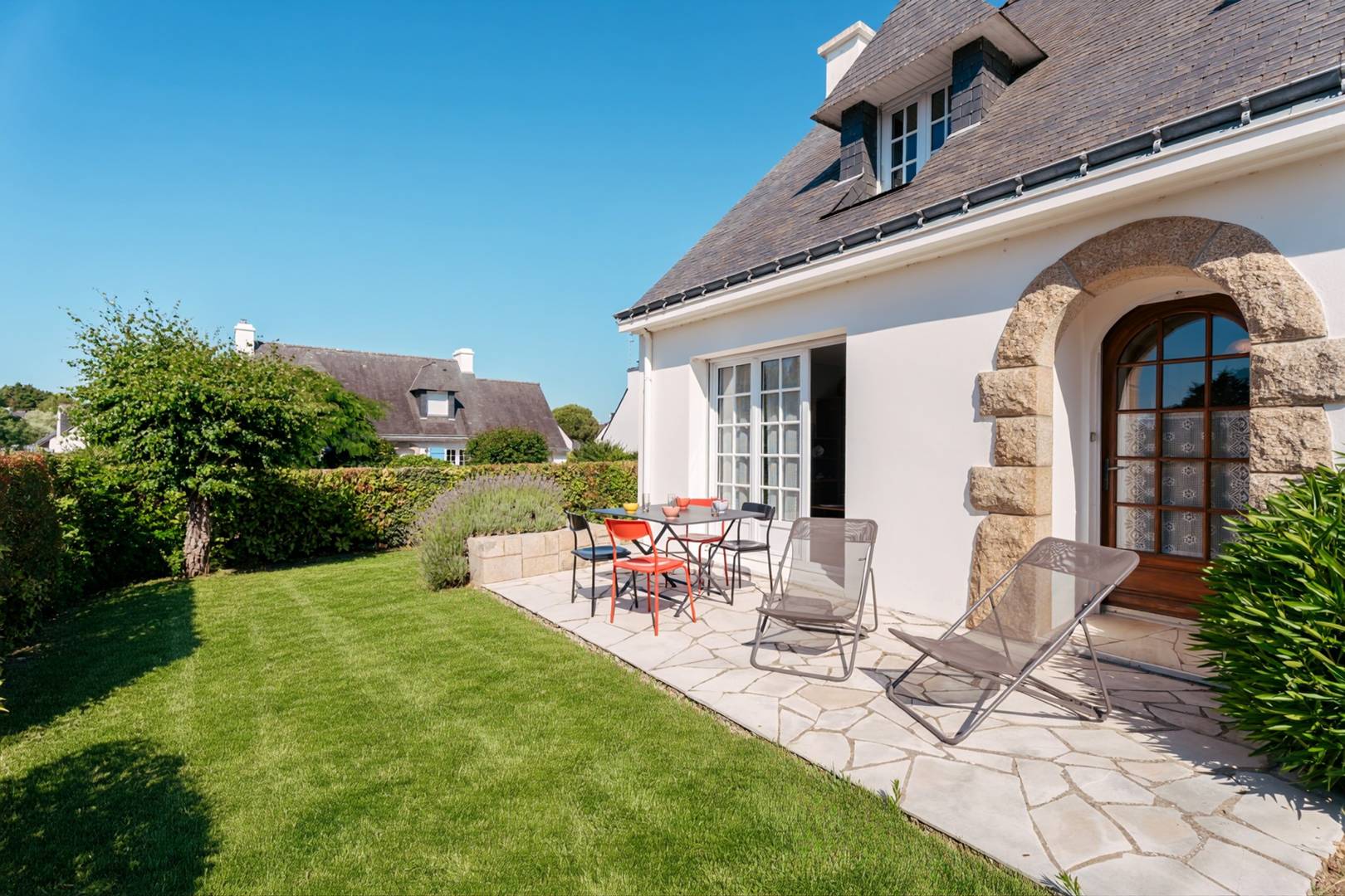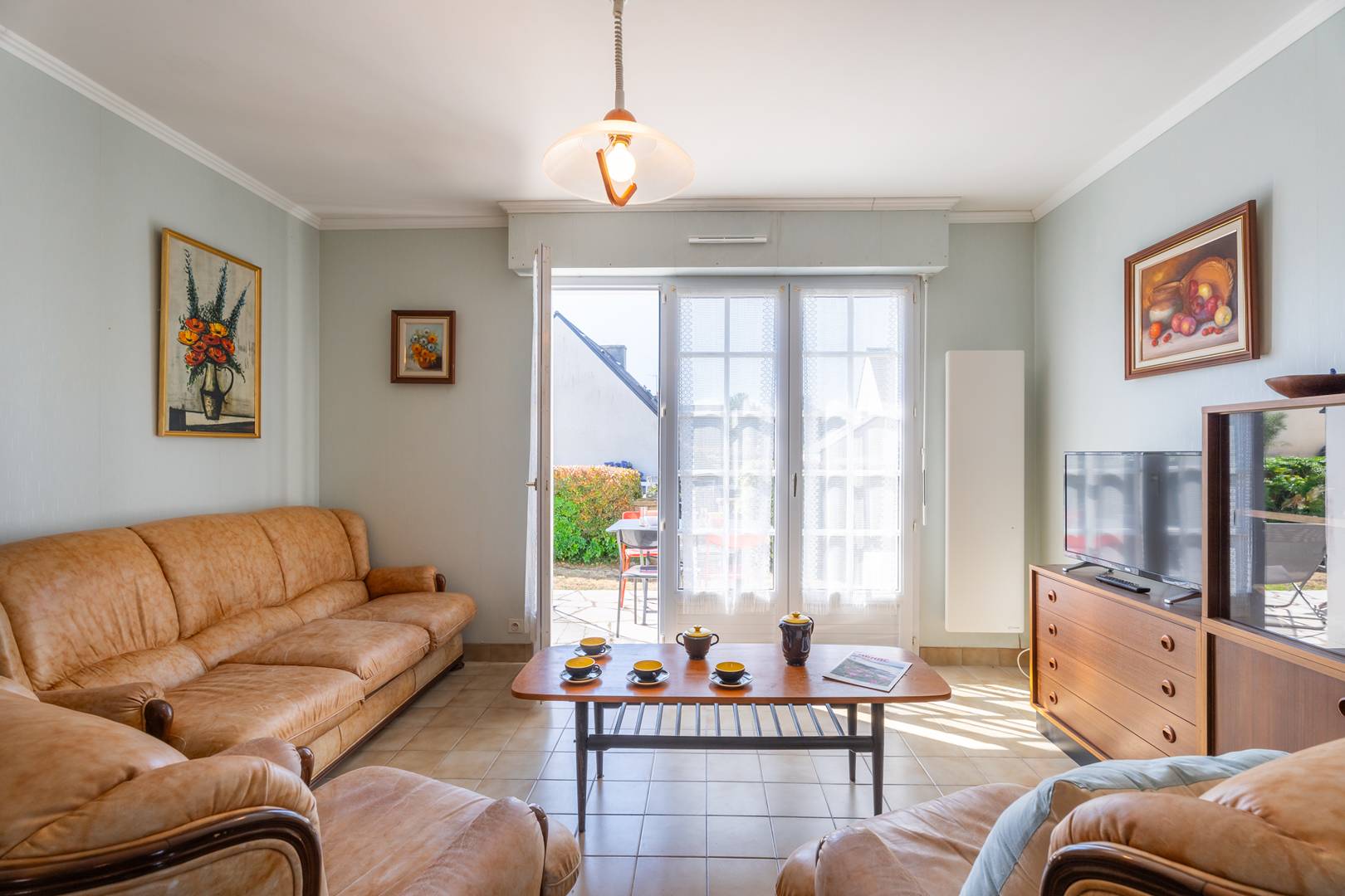 - Living room with dining area (table and chairs) and lounge area (sofa, armchairs, TV) opening onto a South-facing terrace extended by the enclosed garden (garden furniture)