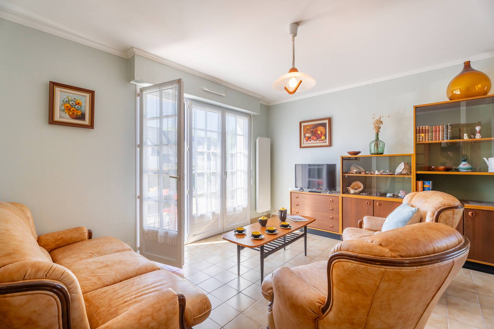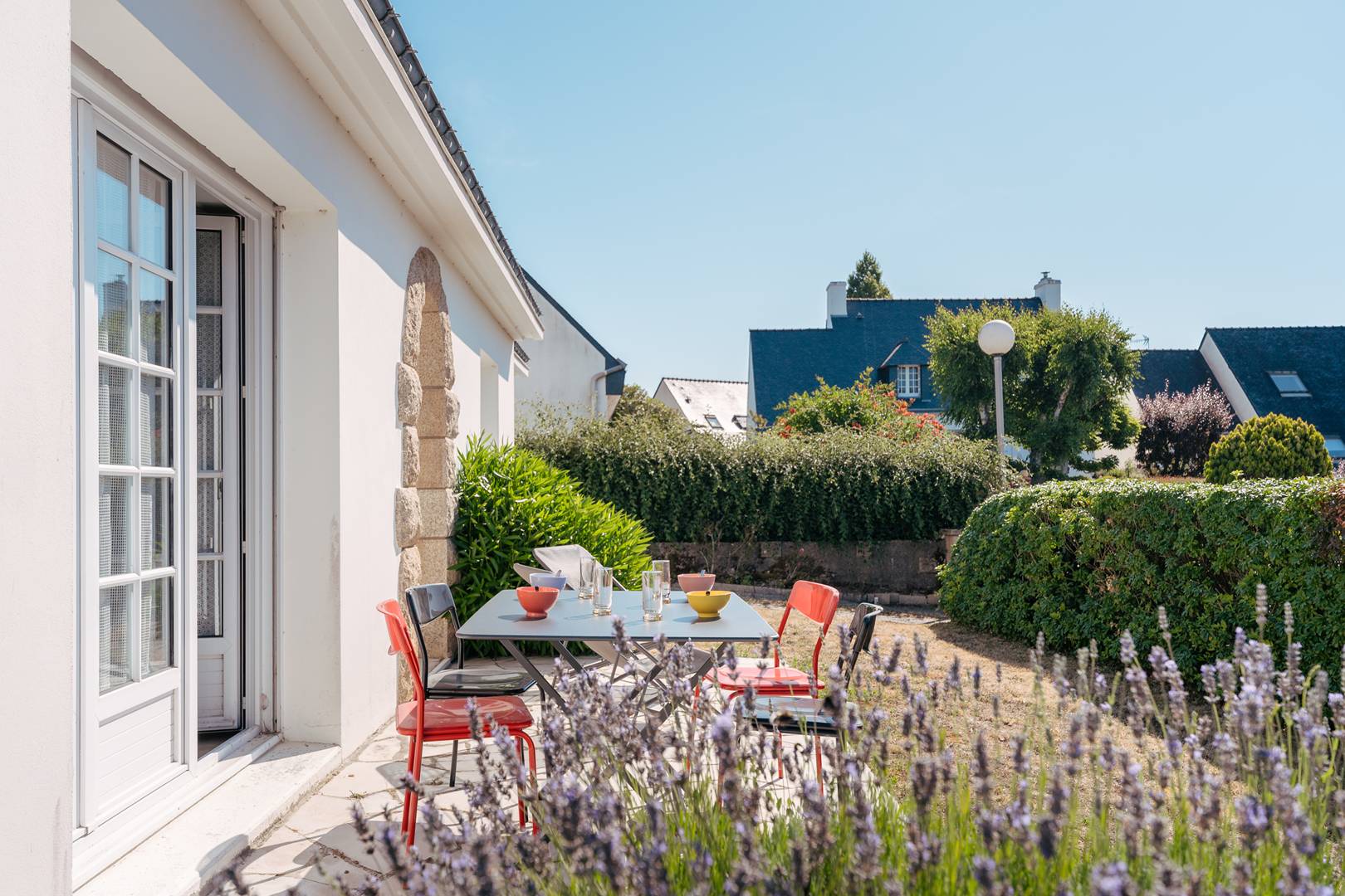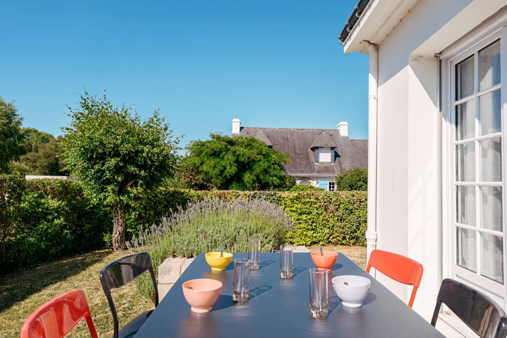 - Living room with dining area (table and chairs) and lounge area (sofa, armchairs, TV) opening onto a South-facing terrace extended by the enclosed garden (garden furniture)