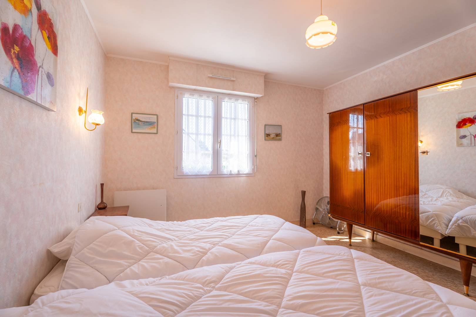 - 1 bedroom with 2 twin single beds (90 cm, duvets) and wardrobe