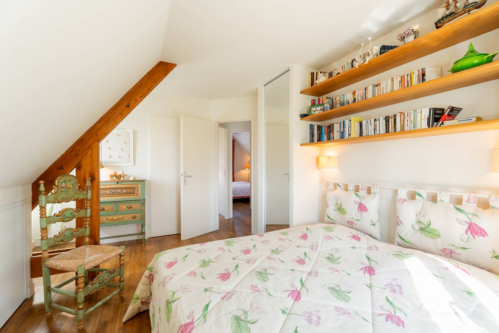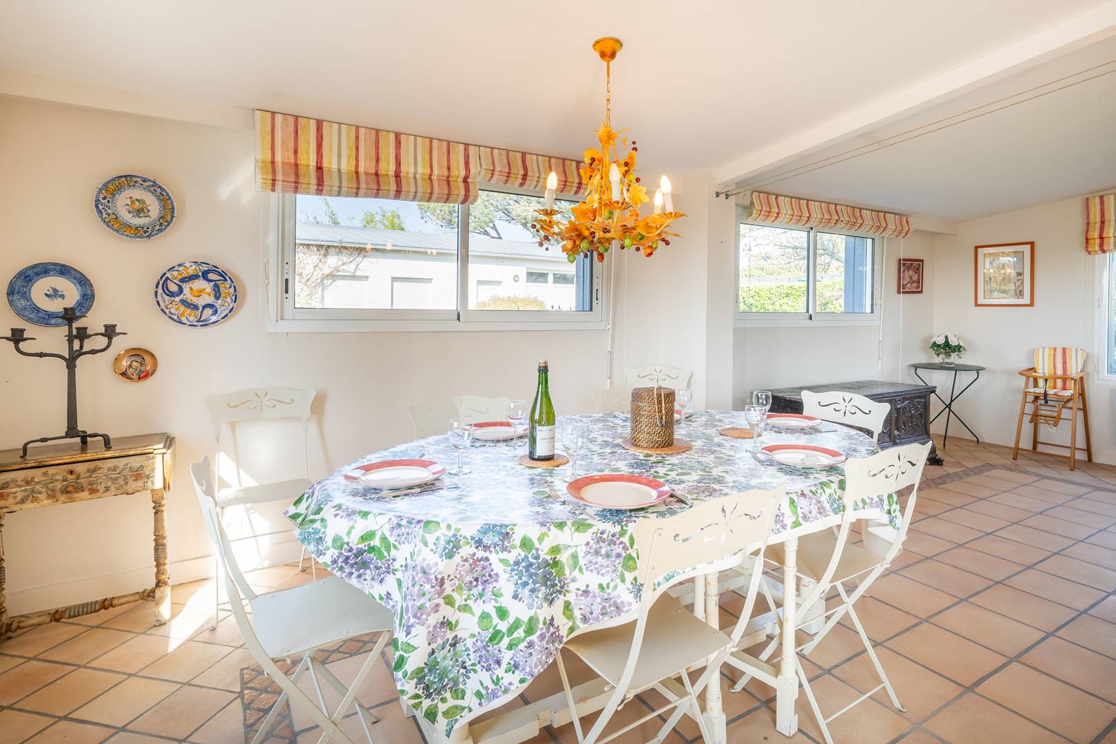 - Living room with dining area (table and chairs) and lounge area (TV, sofa, armchairs) also opening onto the South-facing terrace (garden furniture, barbecue) and extended by the large enclosed private garden
