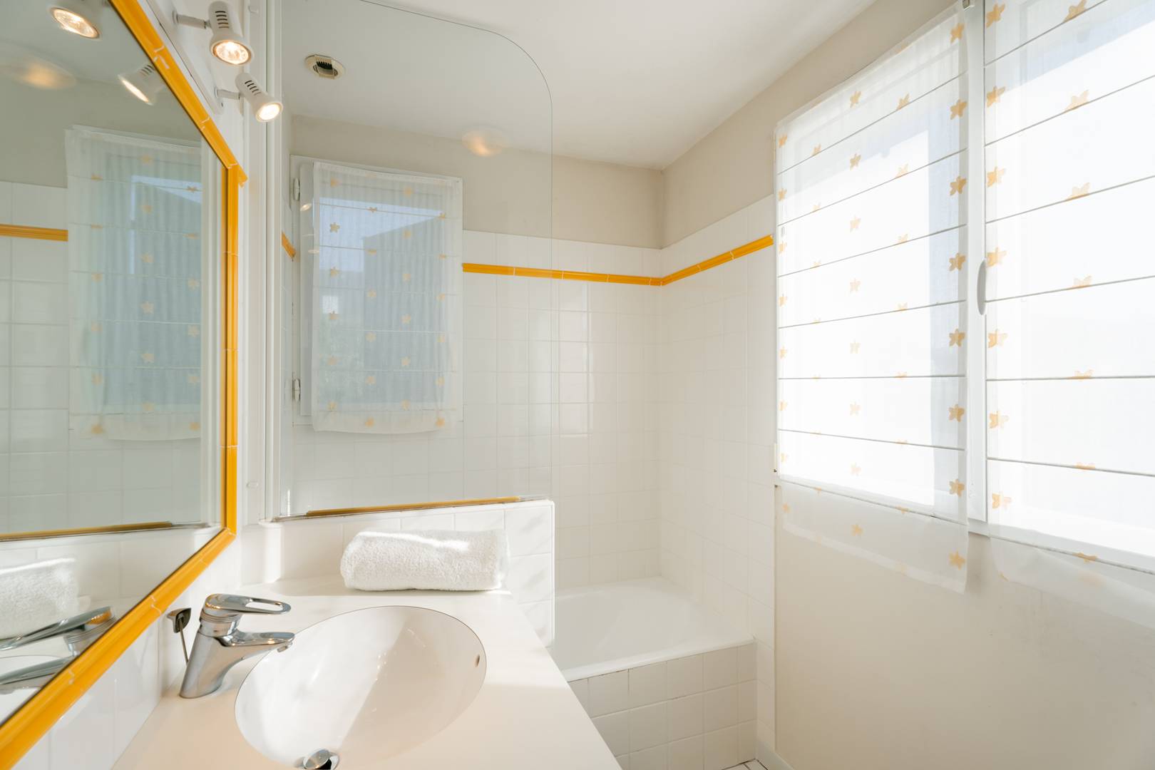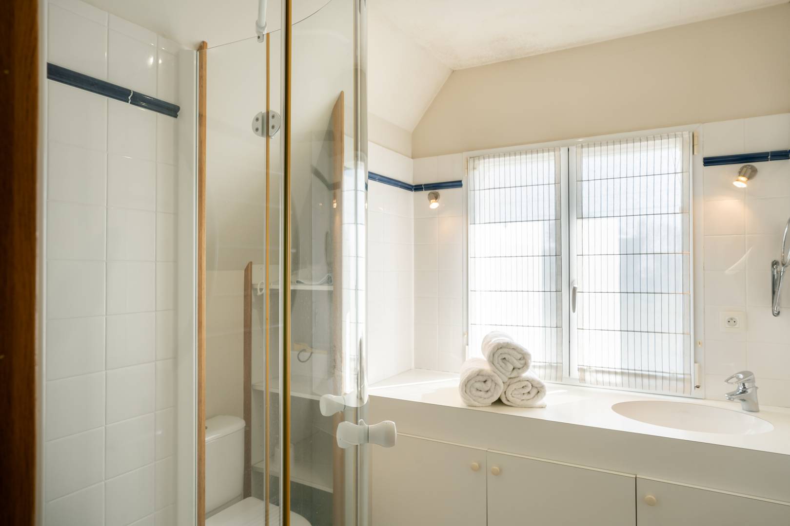 - Semi-open and equipped kitchen (4-ring ceramic hob, oven, microwave, fridge/freezer, dishwasher) opening onto the South-facing terrace with SEA VIEW