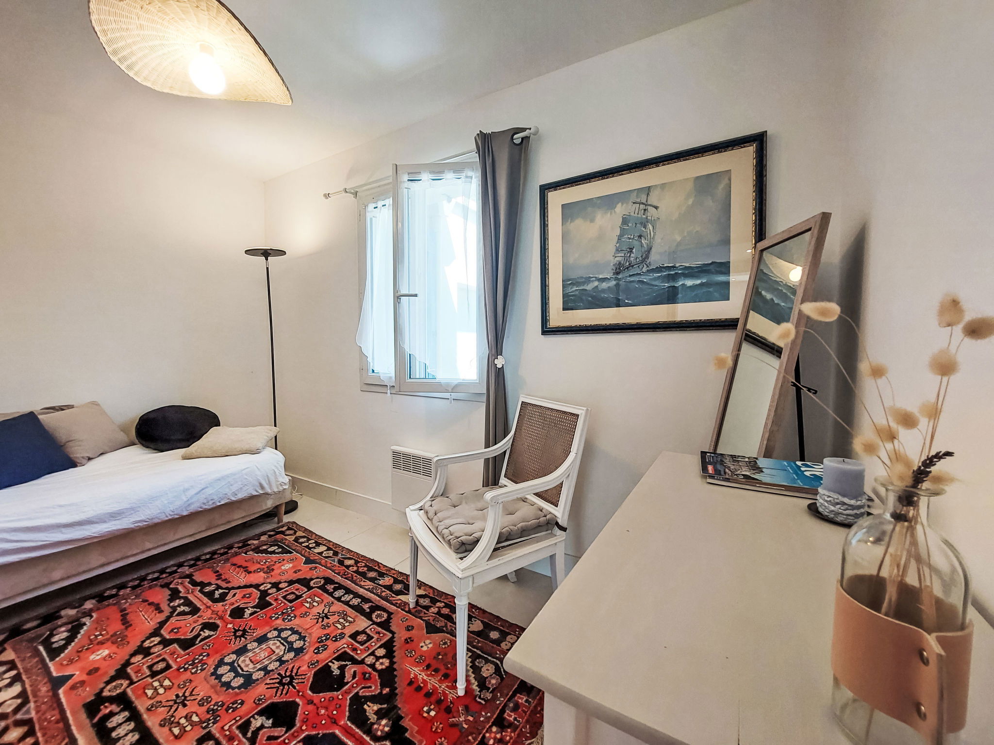 5-room house 150 m2 on 2 levels, on the ground floor. Beautiful furnishings: living/dining room with TV (flat screen). 1 room with 1 french bed (1 x 160 cm, length 200 cm). 1 room with 1 bed (80 cm, length 200 cm). Open kitchen (dishwasher, 4 ceramic glass hob hotplates, microwave, freezer, electric coffee machine, Capsules for coffee machine (Nespresso) extra). Shower, sep. WC. Upper floor: 1 room with 1 bed (90 cm, length 190 cm), 1 french bed (1 x 160 cm, length 200 cm), shower. 1 room with 2 beds (80 cm, length 200 cm). Sep. WC. Electric heating. Barbecue. Facilities: washing machine, children's high chair, baby cot. Internet (WiFi, free). Please note: maximum 1 pet/ dog allowed. Smoke alarm. 562330000534I