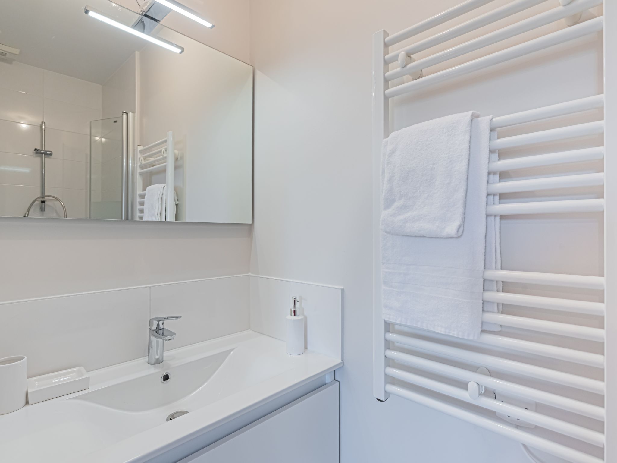 4-room house 100 m2 on 2 levels. Comfortable and beautiful furnishings: living/dining room with TV (flat screen). Exit to the terrace. 1 room with 2 beds (80 cm, length 200 cm), hand-basin and shower. Open kitchen (oven, dishwasher, 3 ceramic glass hob hotplates, toaster, kettle, microwave, freezer, electric coffee machine, Capsules for coffee machine (Nespresso) extra). Sep. WC. Upper floor: 1 room with 2 beds (90 cm, length 200 cm). 1 room with 1 french bed (1 x 160 cm, length 200 cm). Bathroom, sep. WC, double hand-basin. Terrace 20 m2. Terrace furniture, electric barbecue, deck chairs (4). View of the garden. Facilities: washing machine, dryer, iron, hair dryer. Internet (WiFi, free). Reserved parking (2 cars). Please note: smoke alarm.