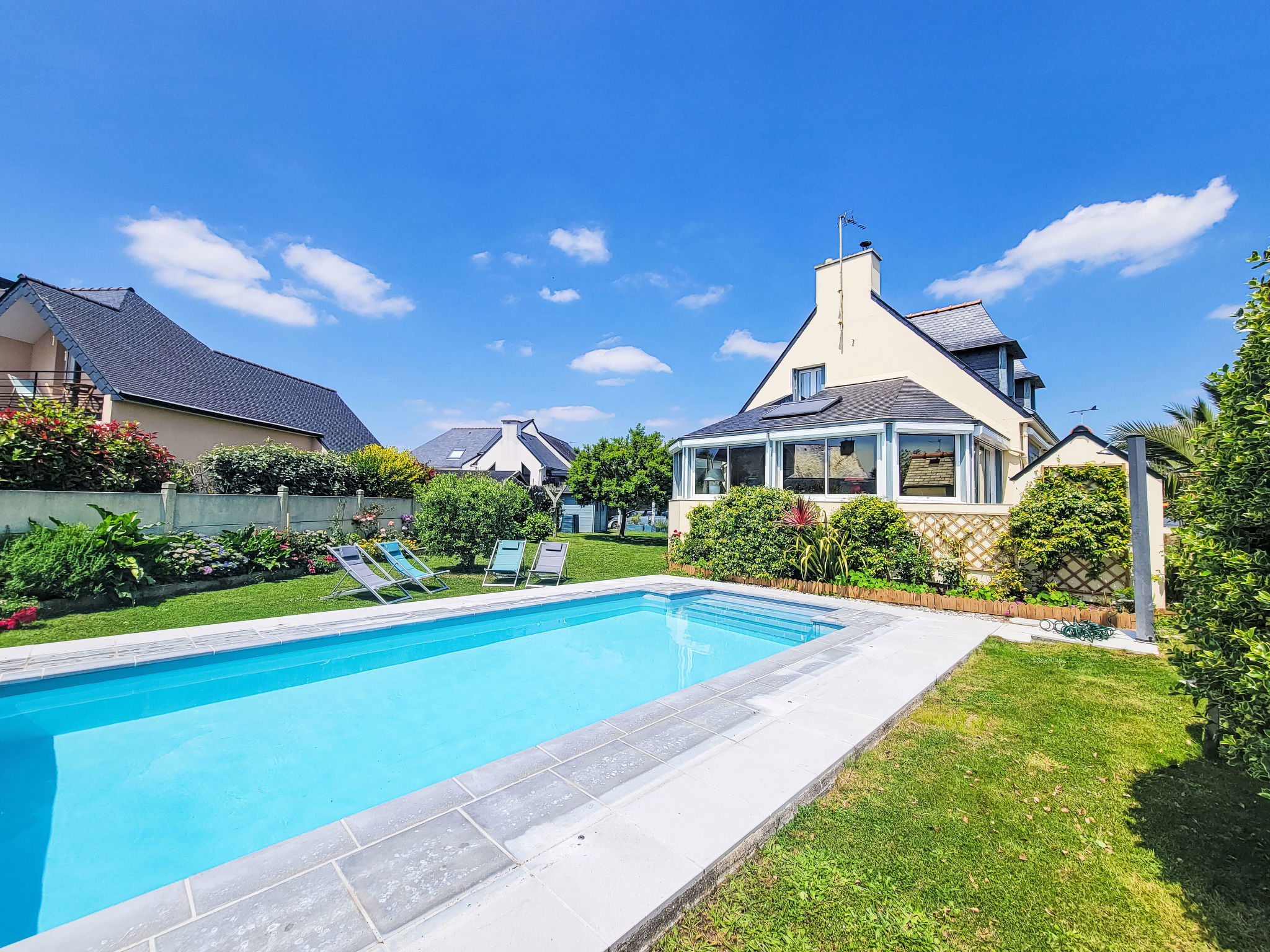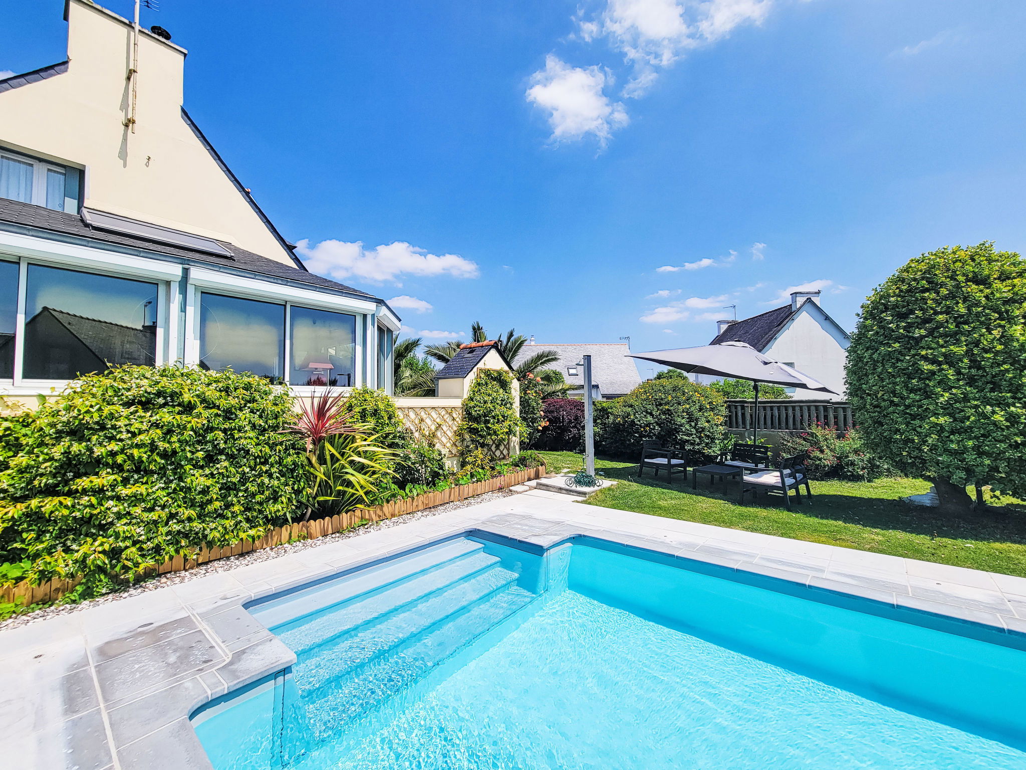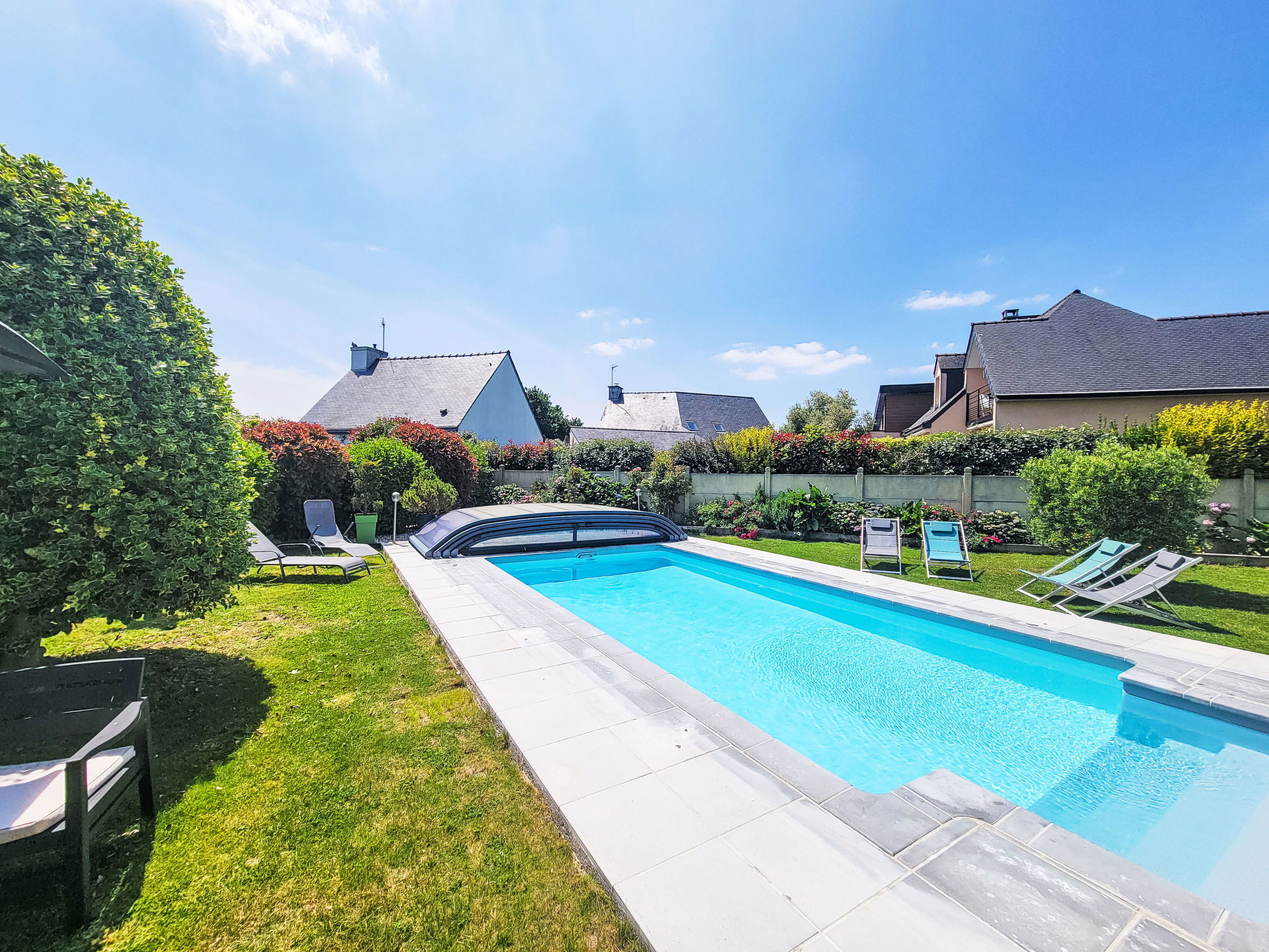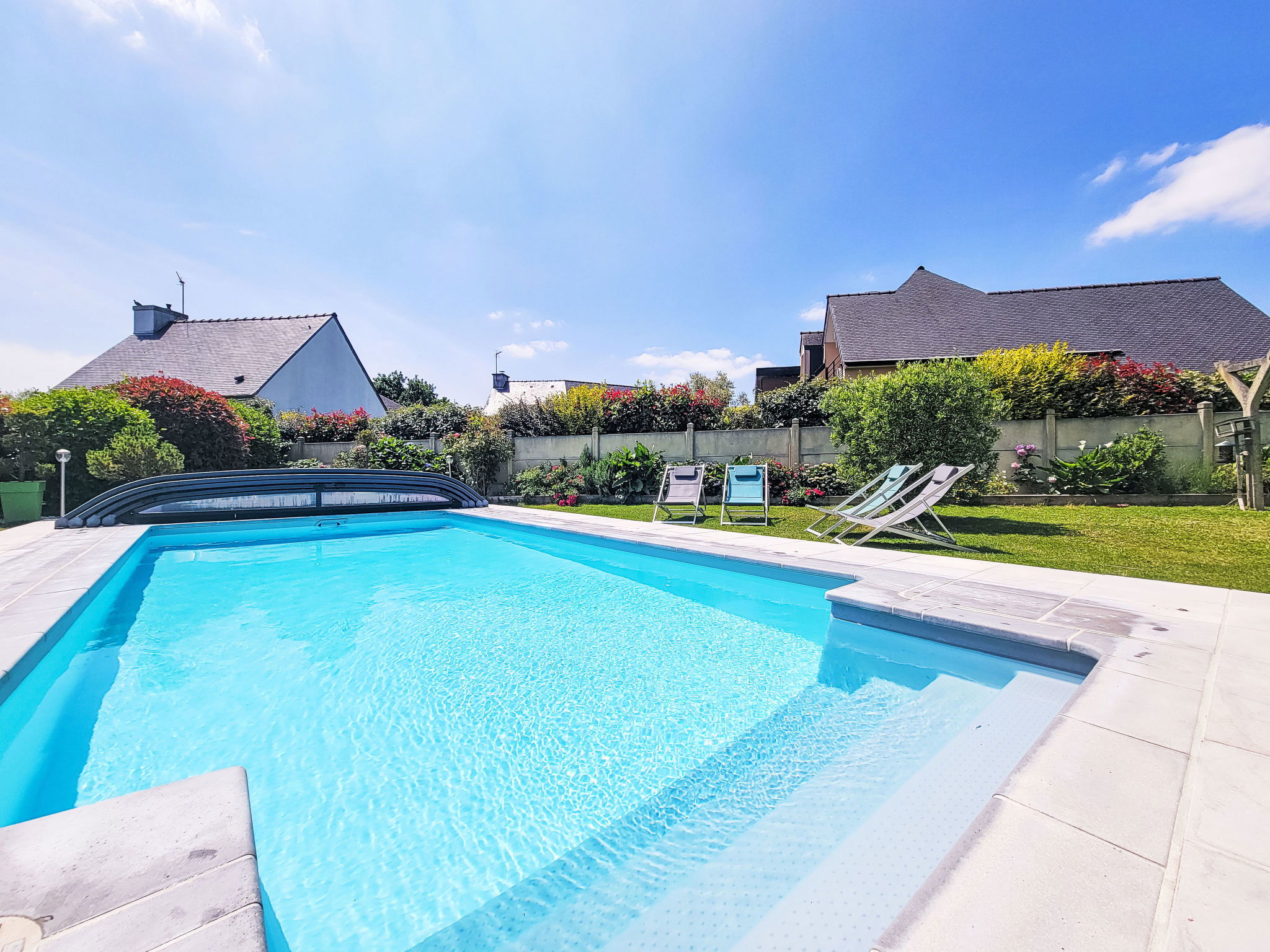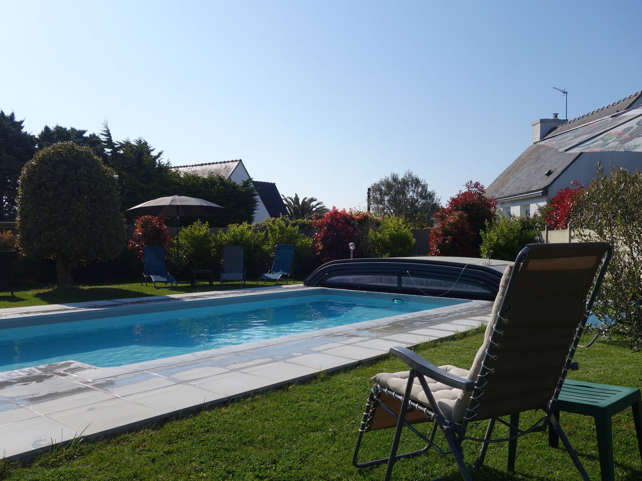 Saint Philibert 8 km from Carnac: Large single-family house "Phil'blue". In the centre of Saint Philibert, 400 m from the sea, 1 km from the beach. Private: well-kept garden 1'000 m2 (fenced), indoor pool angular, heated, secured (8 x 4 m, depth 140 - 160 cm, seasonal availability: 01.Apr. - 19.Sep.). Outdoor shower. In the house: storage room for bicycles. Grocery 400 m, supermarket 2 km, restaurant, bakery 400 m, sandy beach "Men er Belleg ou Kernevest" 1.6 km, thermal baths "Thalasothérapie Thalazur" 8 km. Golf course (18 hole) 12 km, sailing school 1.6 km, riding stable 4 km. Nearby attractions: La Trinité Sur Mer 4 km, Carnac et ses alignements 8 km, Presqu'île de Quiberon 15 km, Vannes 35 km, Plage de Locmariaquer par voie cyclable 7 km, Belle ile en Mer, Houat, Hoedic. Hiking paths: Le Golfe du Morbihan.